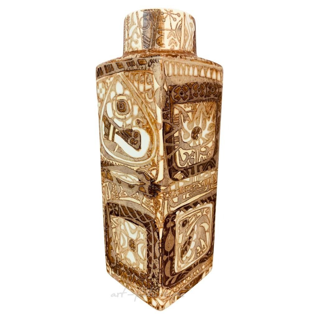 Одна из самых редких ваз из серии Royal Copenhagen «Baca». Декор разработан Нильсом Торссоном в 1960-е годы, а эта ваза производилась в период с 1969 по 1974 год. Ваза украшена стилизованным орнаментальным декором. 1960-е годы Нильс Торссон (1898-1975) матово-коричневая глиняная ваза из глинозема производства Royal Copenhagen, Дания, из серии Baca Fajance. На четырех сторонах вазы изображено множество абстрактных птиц, необычных цветов и существ. Ваза имеет сложный дизайн с огромным количеством деталей на такой маленькой площади. Отштамповано на основании маркировано 719/3259. Размеры: Глубина: 7,5 см. Ширина: 7,5 см. Высота: 22,5 см. Royal Copenhagen Baca Flask Vase Нильс Йохан Торвальд Торссон (1898–1975) Художник по керамике и дизайнер Royal Copenhagen – Aluminia. Нильс присоединился к Royal Copenhagen в качестве ученика в 1912 году и окончил Датскую королевскую академию в 1917 году. В дальнейшем он стал самым плодовитым дизайнером Royal Copenhagen. Он был художественным руководителем Royal Copenhagen с 1949 года, а также художественным руководителем Aluminia с 1928 по 1969 год. Нильс разработал как минимум 5 самых известных производственных линий для Royal Copenhagen Aluminia. Работы Торссона как дизайнера сильно варьировались от натуралистических мотивов с изображением птиц, рыб и бабочек до абстрактных и геометрических мотивов. Во время своего пребывания в Royal Copenhagen Торссон был самым плодовитым дизайнером фабрики, разработав для компании как минимум пять самых известных производственных линий, включая Solberg (1930-е годы); Marselis (Alumina, 1950-е) — элегантная, но доступная линия для повседневного использования; Тенера (1960-е); Бака (1960-е годы) с очень подробным и сложным рельефом; и Диана (1970-е), а также многие другие изделия в глазури, которые менее известны и их труднее найти на винтажном рынке. И в сериях Baca, и в Tenera использовались формы, разработанные самим Торссоном, а другие были результатом командной работы. Предметы и узоры Торссона отмечены его шифром на основании. Торссон скончался в 1975 году в Копенгагене. Сегодня его глиняные изделия середины века чрезвычайно востребованы как коллекционерами, так и любителями дорогого винтажа.