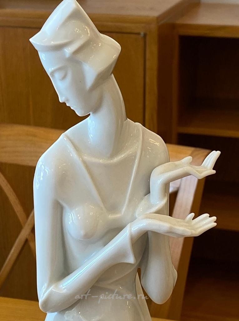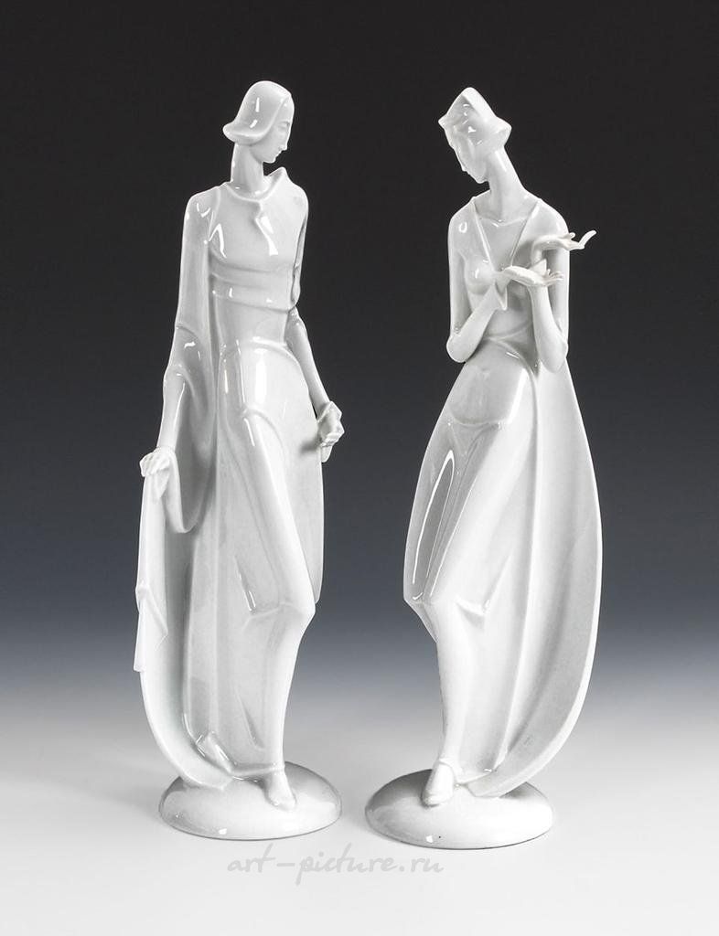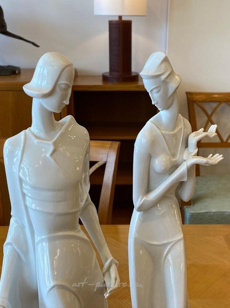 Скульптурная композиция "Принц и Принцесса" Герхард Шлипштайн Gerhard Schliepstein, Rosenthal - Считается лучшей его работой!! Герхард Шлипштейн, Парные статуэтки Принца и Принцессы, стоящие на сводчатом круглом постаменте, Герхард Шлипштейн, 1926. Модельные номера К 826 и К 827. Марка мануфактуры. Высота 46 см - 47 см. Образцы, характерные для стиля Шлипштейна, впечатляют подчеркнуто удлиненными пропорциями, резкой, частично плоской лепкой и выразительными жестами. В творчестве выдающегося скульптора можно найти ряд сопоставимых работ, созданных в 1925-33 годах, в том числе "Женщина с косулей", "Сюзанна", "Флейтист" и женский бюст "Преображение". С 1911 года он создавал фарфоровые фигурки, до 1925 года для Королевской фарфоровой мануфактуры в Берлине, затем для мастерских Шварцбурга, Хойбаха, Плауэ, Мейсена, а с 1929 года - исключительно для Розенталя. Известная пара фигур "Принц" и "Принцесса" также была отлита из бронзы Ноаком в Берлин-Фриденау. См. Николь, Розенталь, том III, стр. 108 F., Том V, стр. 196. Пара фарфоровых подвесных фигурок в стиле ар-деко "Принц" и "Принцесса", выполненных по модели Г. Шлипштейна. Знак производителя. Rosenthal. В начале 1930-х гг.
