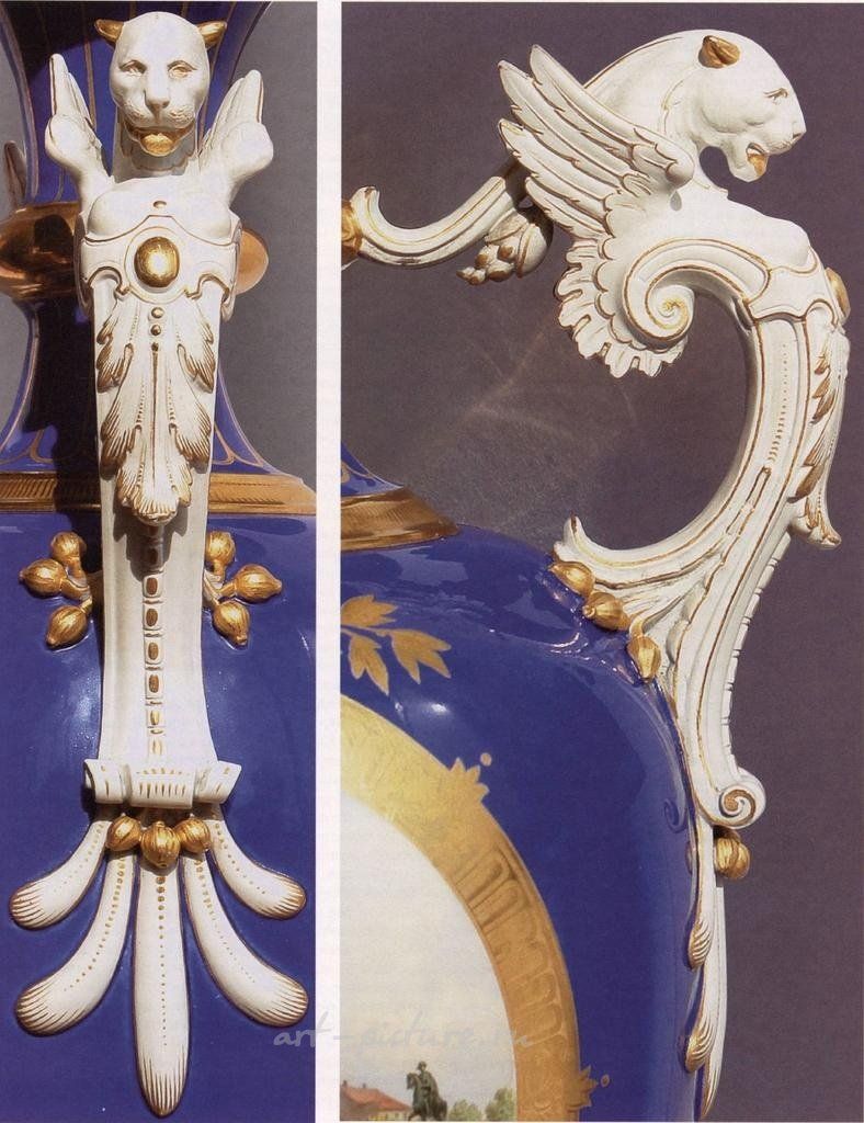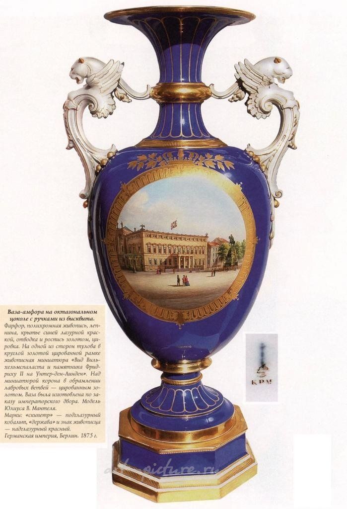 Ваза-амфора на октагональном цоколе с ручками из бисквита. Фарфор, полихромная живопись, лепнина, крытье синей лазурной краской (Королевский голубой фонд), отводка и роспись золотом, цировка. На одной из сторон тулова в круглой золотой цированной рамке живописная миниатюра «Вид Вильхельмс палас и памятник Фридриху II на Унтер-ден-Линден» (Старый дворец ( нем . Altes Palais ), также называемый дворцом кайзера Вильгельма (Kaiser-Wilhelm-Palais ), — бывшая королевская прусская резиденция на бульваре Унтер-ден-Линден в Митте). Над миниатюрой корона в обрамлении лавровых ветвей цированным золотом. Ваза была изготовлена по заказу императорского двора. Модель Юлиуса В. Мантеля. Марки: «скипетр» - подглазурный кобальт, «держава» и знак живописца надглазурный красный. Германская империя, Берлин. 1875 г. Высота 52 см. Данная ваза представлена в журнале Антиквариат №51 (10) на стр. 34 -35, за октябрь 2007. На вазу имеется искусствоведческая атрибуция. Обзор рынка фарфора KPM Оценка рынка фарфора — довольно непростая задача. На ценообразование влияют множество факторов: ; время создания вещи, ее уникальность и редкость, качество живописи и, наконец, ее состояние. Как известно, для анализа рынка предметов многие коллекционеры опираются на каталоги торгов западных аукционов. Но оценка вещей аукционом не является абсолютным индикатором цен, поскольку аукцион - третья сторона. Большинство вещей продают и покупают, как правило, дилеры, которые более чем готовы вкладывать деньги в хорошие вещи. Зачастую вещи, купленные дилером, будут перепроданы коллекционерам по гораздо более высокой цене, такой, которую вы не найдете ни в одном каталоге! В последние годы в России заметно возрос интерес к предметам искусства. В любой стране, переживающей бурный экономический подъем, появляются весьма обеспеченные люди, которые, заработав деньги и удовлетворив все свои первичные потребности, обращают свой взор на предметы искусства. Сначала в ряды крупных покупателей антиквариата влились арабы, японцы, за ними — индусы, не заставили себя ждать и россияне. Сейчас Европа на очередной модной волне — китайской. «Новые» китайцы скупают буквально все, что может, по их мнению, вписаться в интерьеры их мини Версалей! За короткий период произошло «вымывание» с антикварного рынка колоссального числа предметов. Немаловажную роль в этом сыграли и многочисленные туристы, которые, путешествуя по странам Европы, приобретали на память чашку или тарелку с прекрасным видом, благо цены на фарфор 10-—15 лет назад были совсем другого порядка. Сейчас же даже в Вене не купить видовых чашек — не то что Венской мануфактуры, но даже «типа Вены» не осталось! Та же ситуация во Франции и в Германии, не говоря уж о России. Если в 90-е годы XX века на российском антикварном рынке предложение в разы превышало спрос, то сейчас ситуация изменилась кардинально. Пополнить коллекцию хорошим предметом — большая и очень дорогостоящая удача. С одной стороны, учитывая объемы производства, фарфор KPM — нередкий гость на антикварном рынке. С другой — редкие и уникальные вещи с высококачественной живописью встречаются нечасто и ценятся весьма высоко. Еще несколько лет назад цена на ординарные чашки составляла 300—500 евро. Сейчас на европейском рынке стоимость ординарной чашки колеблется от 1000 до 3000 евро. Цена же высокохудожественной