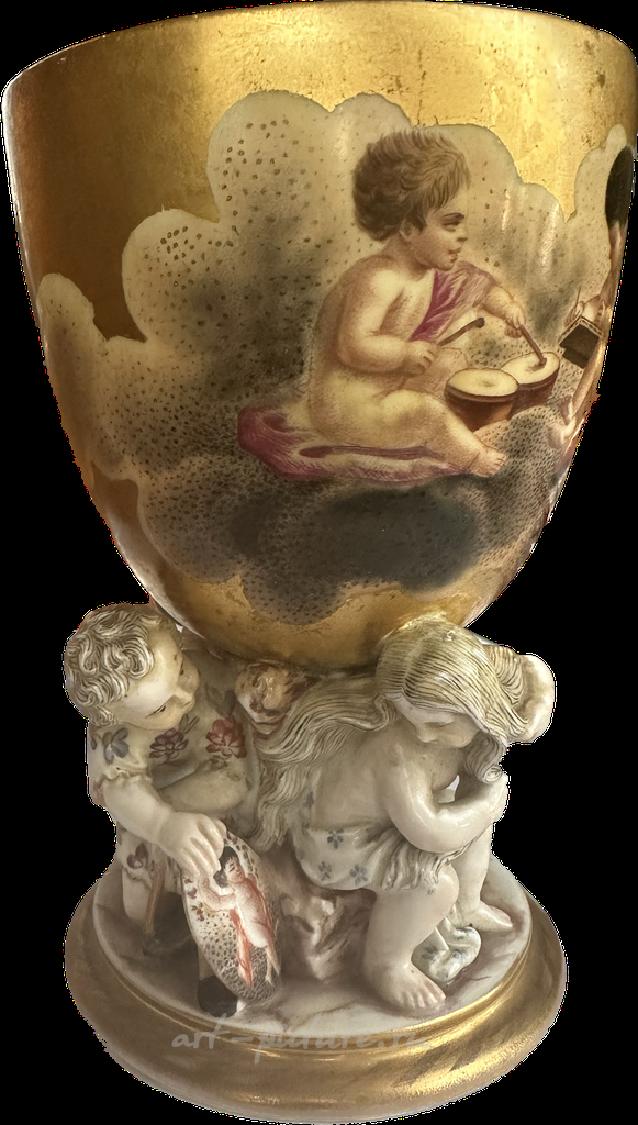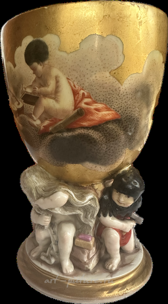 Редкий предмет! Мануфактура KPM. Старинный коллекционный фарфоровый кубок. Полихромная роспись. Великолепное исполнение. Кубок украшен фигурными виньетками с изображением херувимов в облаках и мифологических сцен на позолоченном крытье. Кубок имеет формованную ножку различной фигурной формы-девочка заплетающая косы, мальчик с щитом, мальчик с молотком и щипцами и сказочная сова наблюдающая за детьми. Художник уделил большое внимание деталям. Клеймо: KPM. Размеры: объём 275 мл, высота 12,5 см, диаметр 8,5 см, диаметр основания 8 см. Материал: фарфор. Состояние: без повреждений и реставраций.