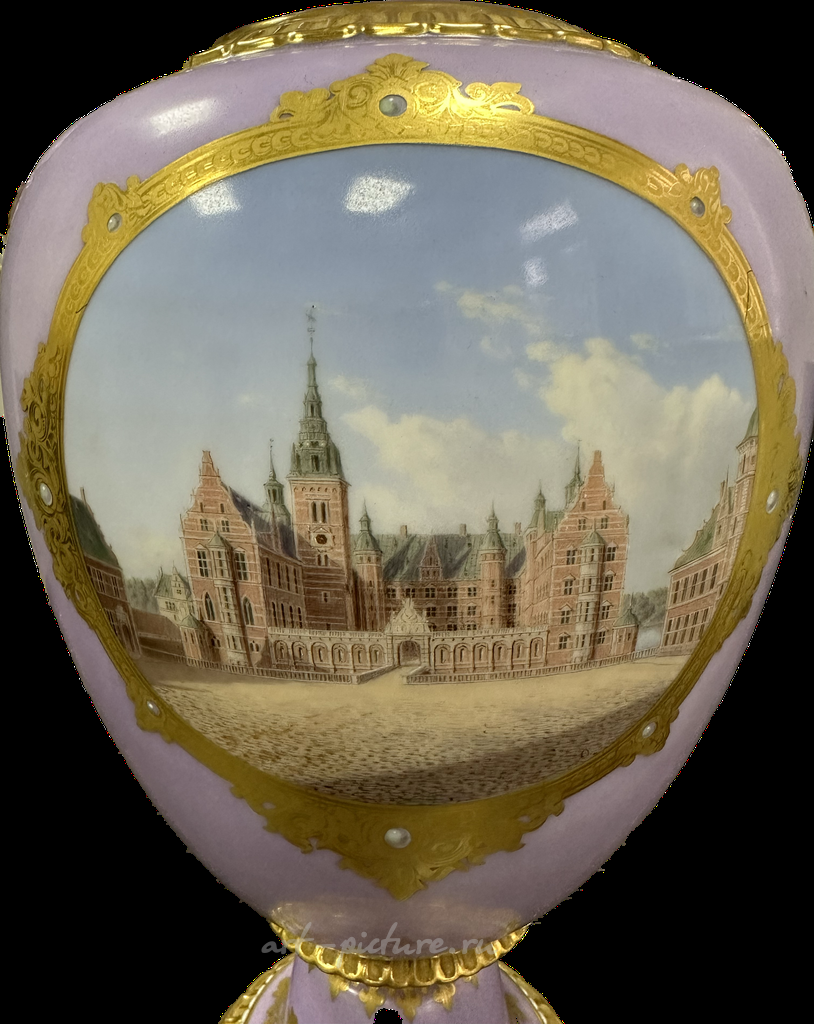 Ваза с изображением Замка Фредериксборг Frederiksborgг, в городе Хиллерёд . Royal Copenhagen середина 19 века, ручки вазы выполнены в виде вьющегося плюща. The Royal Copenhagen Porcelain Manufactory at the Copenhagen Exhibition of 1888. Photography: Junker Jensen. Royal Copenhagen Museum. Фарфор, крытье розовой краской, лепнина, роспись и отводка золотом, живопись. На тулове в овальной орнаментальной рамке живописная миниатюра — вид замка Фредериксборг . Дания, Копенгаген, Королевская Фарфоровая мануфактура. Середина XIX в. Марка три волны - подглазурный кобальт. Данная ваза опублекована в журнале Антиквариат №42 (11) на стр. 75, за ноябрь 2006.