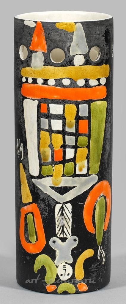 Керамика. Цилиндрическая форма с сквозными отверстиями на фризе. Наружная сторона выкрашена в многоцветный стилизованный рисунок на черном фоне, изображена девушка стоящая на голове, внутри глазурована матовым белым шелковистым слоем. Трехлиниевая маркировка мастерской "Капрон Валлори Франция". Высота 26,2 см. Капрон (1922-2006) основал керамическую мастерскую в Валлори в 1946 году, где также проживал и работал Пикассо с 1948 по 1955 год; в 1954 году он получил золотую медаль на Триеннале в Милане, а в 1955 году серебряную медаль на Первом Интернациональном Фестивале Керамики в Каннах. Французский глазурованный и расписанный керамический сосуд, украшенный изображением стоящей на голове женщины, выполненный Роже Капроном в Валлори. Маркировка. Франция. Валлори. Роже Капрон. Вероятно, около 1955-1960 года.