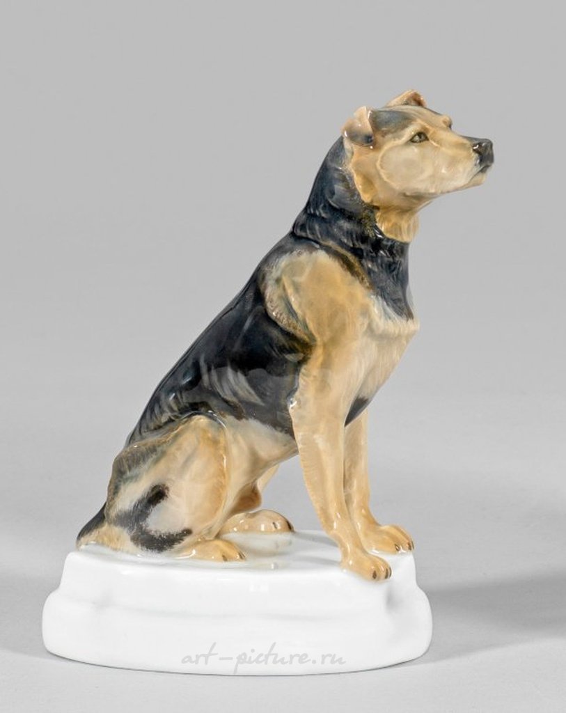 "ЭйрдеЙлтерьер" (оригинальное название). Сидящий терьер в наблюдательной позиции на стилизованной овальной подставке с натуралистичным узором меха. Покрашено подглазурной живописью в бежевые, коричневые и темно-синие тона. Возможно, выполнено Паулем Вальтером, 1912 год. Возможно, монограмма; модельный номер С 202. Тонкая трещина. Не значительное восстановление. Маркировка перекрещенными мечами. Высота 16 см. Изящная фарфоровая фигурка Эйрдейл-терьера в стиле Арт Нуво. Изготовлена фабрикой Мейсен примерно в период с 1912 по 1923 годы.