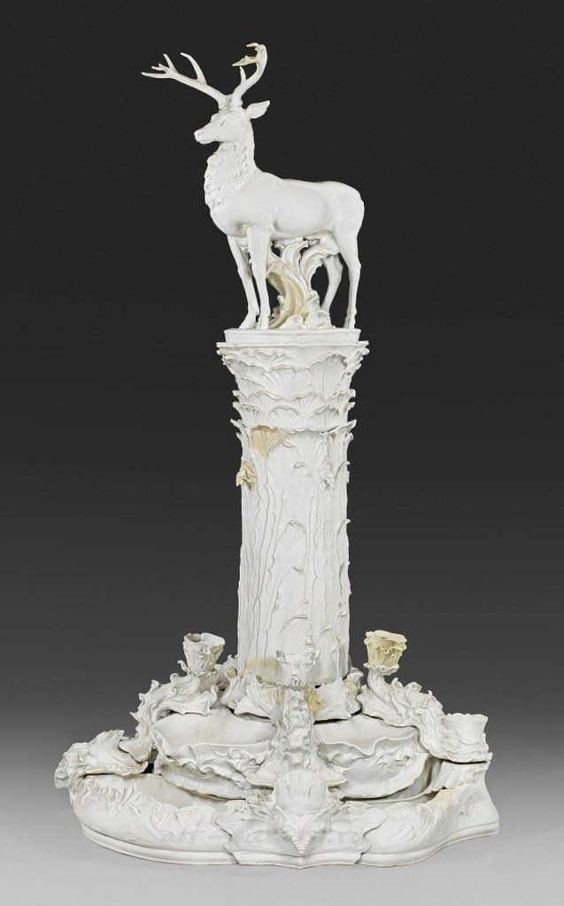 20-й век; разобран. Белая фарфор. Трехстороннее ступенчатое, двухуровневое расположение плоских литых чаш с клювообразными носиками над тройными большими чашами, вертикально разделеными изогнутыми листовыми ступеньками с частично съемными кашпо. Центральная восходящая овальная колонна с четырьмя выступающими листообразными носиками и короноподобной верхушкой. Увенчано величественной фигурой стоящего оленя над древесной опорой на профилированном овальном пьедестале. Роговая корона съемная. Окружающий дизайн с сильным рельефным лиственым узором. Возможно разработано Хуго Майзелем. Монограмма "HM" с датой (19)21. Частично восстановлено; минимальные повреждения. Маркировка изготовителя подглазурной синей краской. Общая высота фонтана приблизительно 260 см. Приблизительно 158 х 115 см. Высота фигуры 105 см (с рогами). Этот впечатляющий фонтан был частью замечательного пространственного дизайна так называемого "Фарфорового дворца", который был высоко оценен прессой и открыт на Лейпцигской весенней ярмарке 6 марта 1921 года. Другая версия этого фонтана неизвестна. Под руководством профессора Ханса Поэльцига работали модельеры Хуго Майзель (1887-1966) и Артур Фойгт (1870-1947), которые также создали общее число 16 животных скульптур огромного размера. Кроме того, архитекторы Ганс Поэльциг и Густав Партц в сотрудничестве с Марлене Мешке разработали электрифицированные настольные лампы, потолочные и настенные светильники, а также фарфоровые консоли, которые достигали высоты до 250 см. Эти экспонаты, произведенные на фарфоровой мануфактуре Волькстедт, привлекли большое внимание общественности, которая восхищалась "разнообразием и захватывающими световыми эффектами осветительных приборов", а также "замечательными гротесками" и трагически выразительными, чрезмерно большими фигурами животных. Производство представляло особое техническое испытание, требующее обширного опыта мастерства. Даже сегодня они считаются техническим и художественным шедевром. Большинство предметов остались белыми, в то время как некоторые были раскрашены яркими акцентными цветами. См. Шёне, Порцелланланд Тюринген, стр. 243 и далее; Каталог Schwarzenburger Werkstätten, стр. 272 и далее; Фриче, Älteste Volkstedter Porzellanmanufaktur, стр. 211 и далее; Циммерманн, в Deutsche Kunst und Dekoration, Том 49, 1921-1922, стр. 46 и далее; Порцелланланд Тюринген, стр. 243 и далее, Cat. Grassi-Museum, Югендстиль, стр. 58. Происхождение: Из состояния значительной частной коллекции северной Германии. Редкий монументальный фонтан из фарфора высотой 260 см с большой фигурой оленя для Лейпцигской весенней ярмарки 1921 года. С монограммой и датой. Частично восстановлен. Небольшие сколы. Маркировка изготовителя подглазурной синей краской. Тюрингия. Фолькштедт-Рудольштадт. Älteste Volkstedter Porzellanmanufaktur. Около 1921 года.