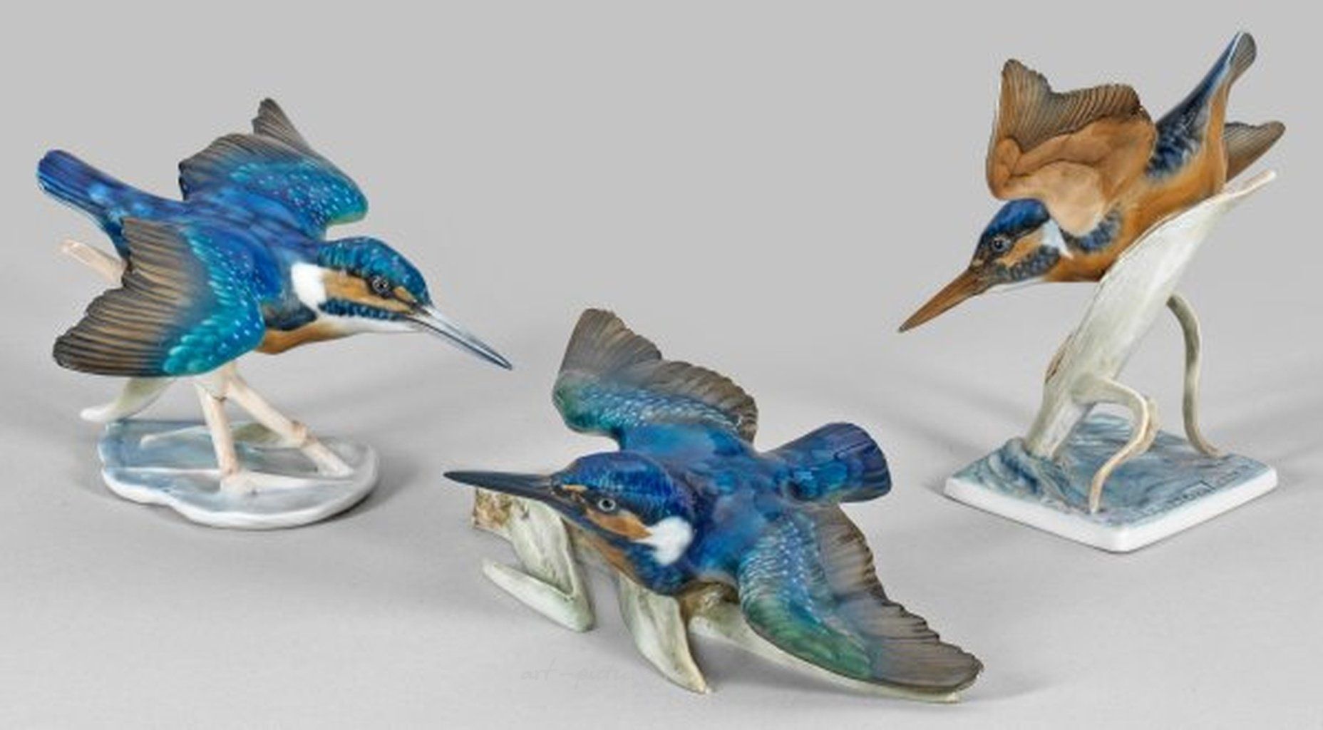 На пьедестале. Полихромная нижняя роспись. Возможно, Ф. Хайденрайх. Частично восстановлено и с незначительными повреждениями. Фабричная марка. Высота 10 см - 17 см. Происхождение: из коллекции значительного частного собрания в Северной Германии. Коллекция из трех фарфоровых статуэток с изображением зимородка. Частично восстановлено. Фирменная марка производителя: Сельб Розенталь. Вторая половина 20 века.