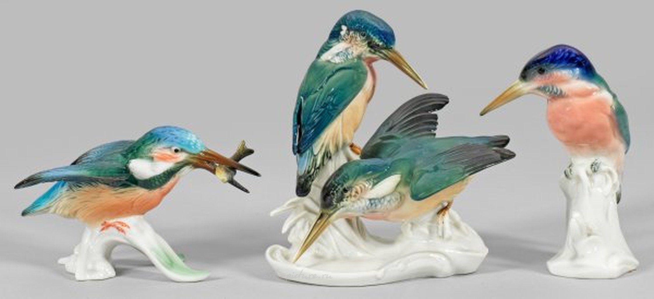 На ветвевидном пьедестале. Полихромная роспись подглазурными красками. Производительский клеймо. В. 9 см - 15,5 см. Происхождение: Из коллекции значимого северогерманского частного собрания. Коллекция из трех тюрингских фарфоровых фигурки зимородка. Производительское клеймо. Тюрингия. Вольксштедт. Карл Энс. XX век.