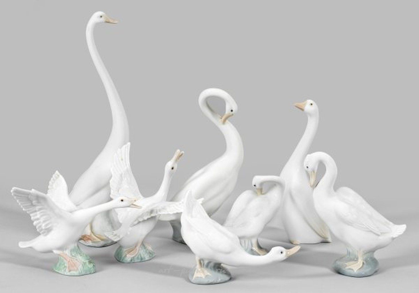 На разных позах, некоторые с поднятыми шеями, эти испанские фарфоровые фигурки гусей демонстрируют сдержанную, пастельно-тонированную подглазурную роспись. Они имеют отметку производителя и имеют высоту от 11 см до 30 см. Эта коллекция происходит из Испании, конкретно из Валенсии, и приписывается мастерской Lladro/Nao. Датируется концом 20-го века.
