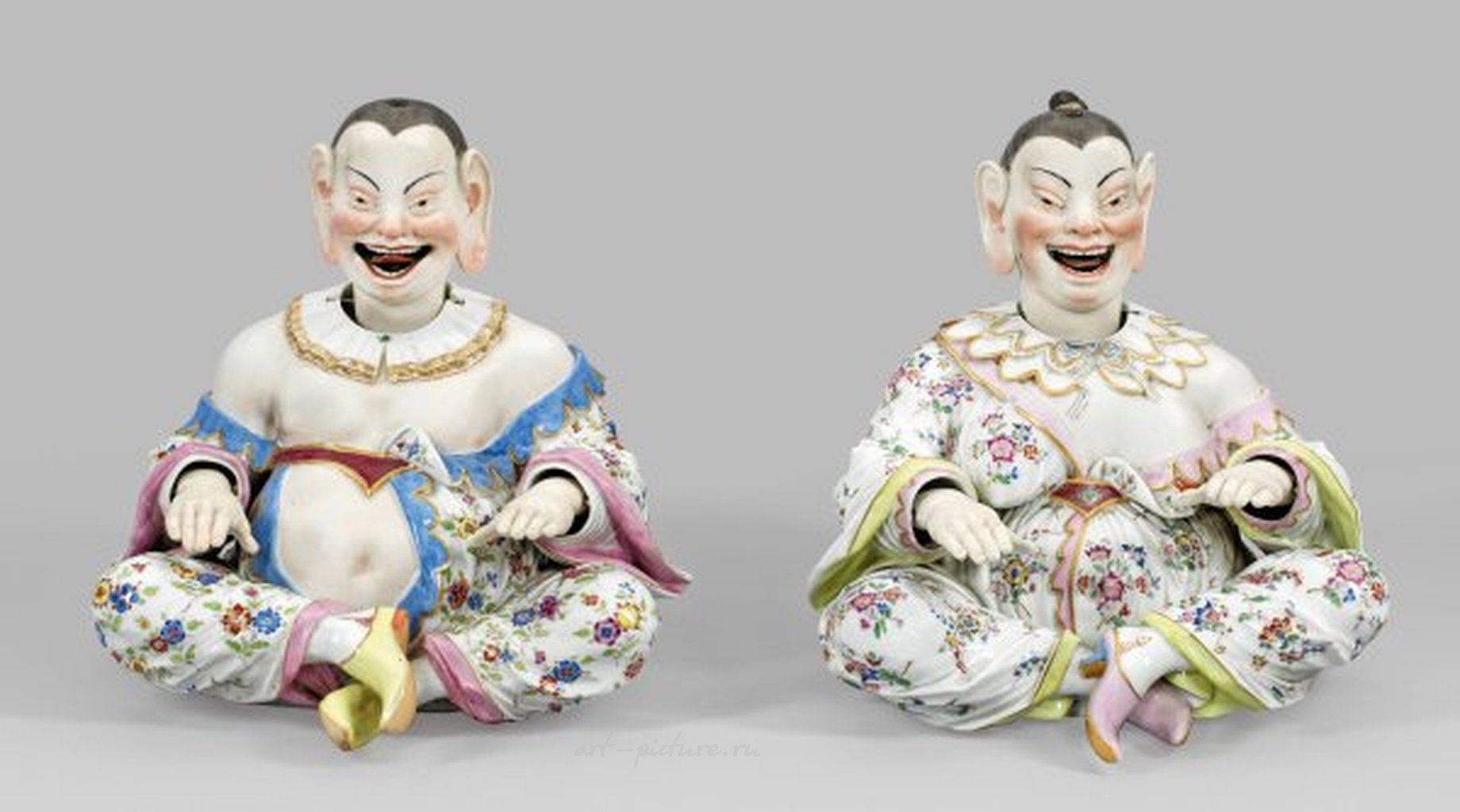 Китаянка, точнее говоря, китаянка в белой одежде с индийскими цветочными узорами, сидит с перекрещенными ногами. Она носит обтягивающий халат с украшенным золотом, украшенным кружевным воротником и желтыми или розовыми вышитыми туфлями. Ее руки, голова и язык подвижны. Многоцветная живопись украшена золотом. Возможно, автором является Иоганн Иоахим Кендлер, но это неизвестно; меч отмечен. Высота: 29 см - 33 см. Предпочтение китайскому искусству явно видно в мануфактуре Мейсен, особенно в необычных фарфоровых фигурках сидящих китаянок. Так называемые кивающие пагоды можно проследить до дизайнов 1762 года, когда Фридрих II Прусский заказал "10 пагод с покачивающимися головами". Пять женских и пять мужских фигур были помещены в интерьер Китайского дома в Санссууси в конце Семилетней войны. См. Каталог Королевской Саксонской фарфоровой мануфактуры, 1904 г., стр. 27, номера 2883 и 2884; Каталог Рюкера, Байер. Национальный музей, номер 1027, Питцш, Каталог "Триумф синих мечей", стр. 144. Пара больших фарфоровых фигур женщины и мужчины, покачивающих головами. Частичные трещины. Незначительные сколы / восстановления. Мечи-кресты. Мейсен. Первая половина 19 века.