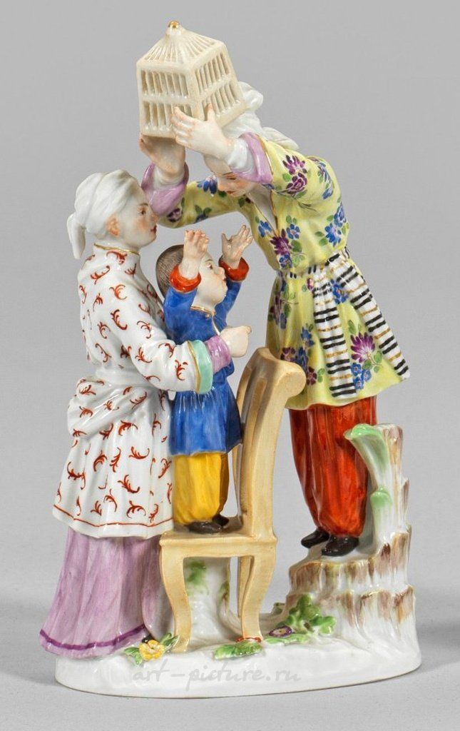 Фигурная группа из фарфора изображает группу китайских женщин или возможно группу китайцев, стоящих на пни пальмы. Одна из женщин держит возвышенными руками клетку для птиц. Перед ней стоит ребенок, удерживаемый старшей девочкой, простирающий руки к клетке для птиц. Картина полихромна с золотистой обводкой. Её авторство возможно принадлежит или Иоганну Иоахиму Кендлеру, или Петеру Райнике. Номер модели 2663. В хорошем состоянии, с небольшой сколом. Помечена перекрещенными мечами. Высота составляет 16 см. См. каталог Государственного фарфорового завода Мейсен, Фигуры II, страница 4, номер 2663. Создано в середине 20-го века.