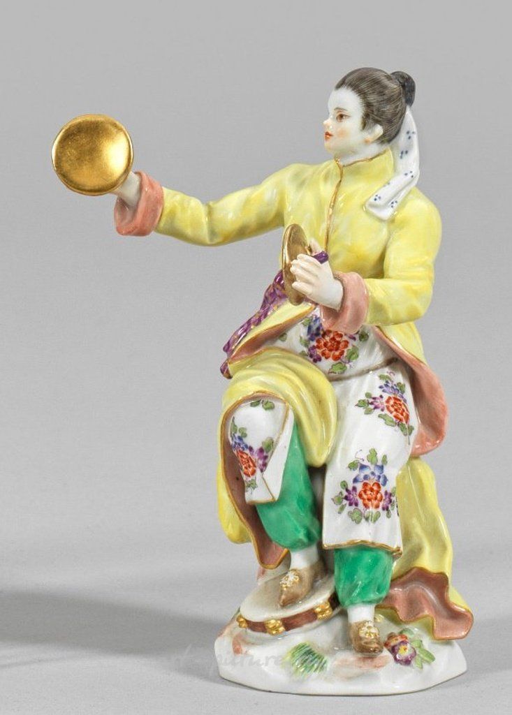 На терракотовом основании сидит японская женщина, бьющая по тарелкам. Полихромная живопись украшена богатыми золотыми элементами. Возможно, работа Фридриха Элиаса Мейера, модельный номер 65665. Восстановлено; присутствует отметка в виде перекрещенных мечей. Высота 13,5 см. См. каталог "Staatl. Porzellan-Manufaktur Meissen, Figuren II, Blatt 2, Nr. E45." Фарфоровая фигура японской женщины с тарелками. Восстановлена. Присутствует отметка в виде перекрещенных мечей. Meissen. После 1973 года.