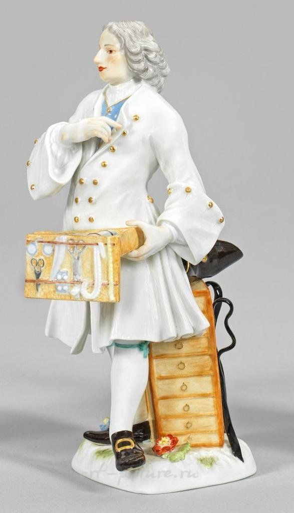 На прямоугольном основании, украшенном пластиковыми цветами и листьями, стоит джентльмен в длинном белом пальто с золотыми пуговицами. В его левой руке он держит открытый деревянный ящик с коротковолновыми радиоприемниками, а его правая рука направлена к груди. На обратной стороне лежит черная шляпа на пьедестале. Полихромная роспись украшена золотом. Это может быть либо работа Иоганна Йоахима Кендлера, либо модель с номером 73103. Мечевая марка. Высота: 19 см. Фарфоровая фигурка горожанина. Мечевая марка. Мейсен. После 1973 года.