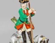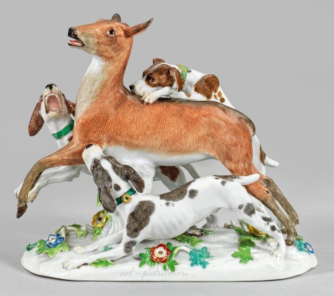 На овале, природно-тематической постаменту, украшенном цветочными лозами, находится полностью пластиковое, живописное изображение ротвейлера, размещенного среди трех собак. Полихромная живопись украшена золотыми штрихами. Возможно, это работа Иоганна Йоахима Кендлера из 1758 года, номер модели 2693. Предмет был восстановлен и имеет марку перекрещенных мечей. Его высота составляет 17,5 см, а длина - 22 см. Сравните с каталогом номер 26 "Порции из фарфора" от Питча. Эта группа фарфоровых фигурок раннего 20-го века изображает охотничью сцену. Она была восстановлена и имеет маркировку перекрещенных мечей. Выполнена в Мейсене в начале 20-го века.