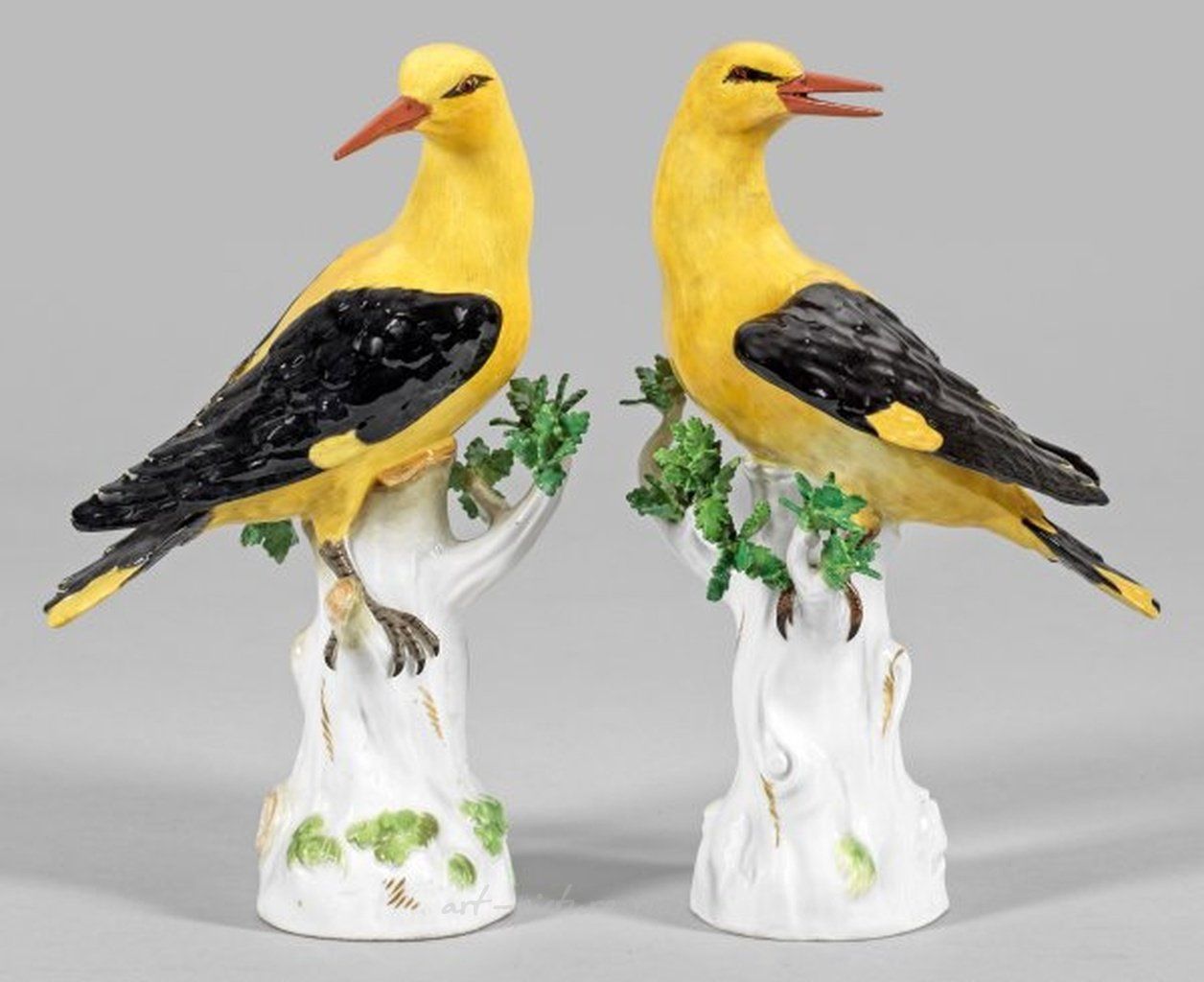 На высокой, с пластиковыми листьями покрытой дубовой ствол сидит Пироли с сложенными или расправленными крыльями. Натуралистичная живопись в желтом и черном цветах, частично рельефные оперения. Поляхромная живопись. Это либо Иоганн Иоахим Кендлер, либо Иоганн Готлиб Эдер. Номер модели 820 и 820x. Восстановлено; марка перекрещенных мечей. Высота 25,5 см. Сравните каталог Государственной фарфоровой мануфактуры Мейсен, «Разноцветные птицы», номер 820 и 820x. Пара подвесных фарфоровых фигур Европейских Золотистых Поползней. Восстановлено. Марка перекрещенных мечей. Мейсен. Около 1900 года.