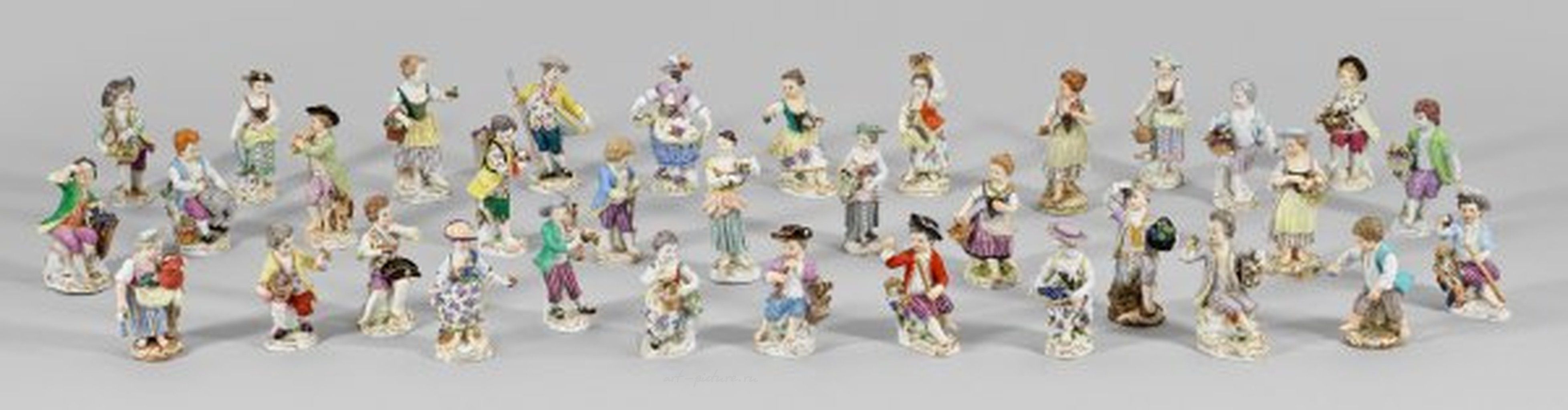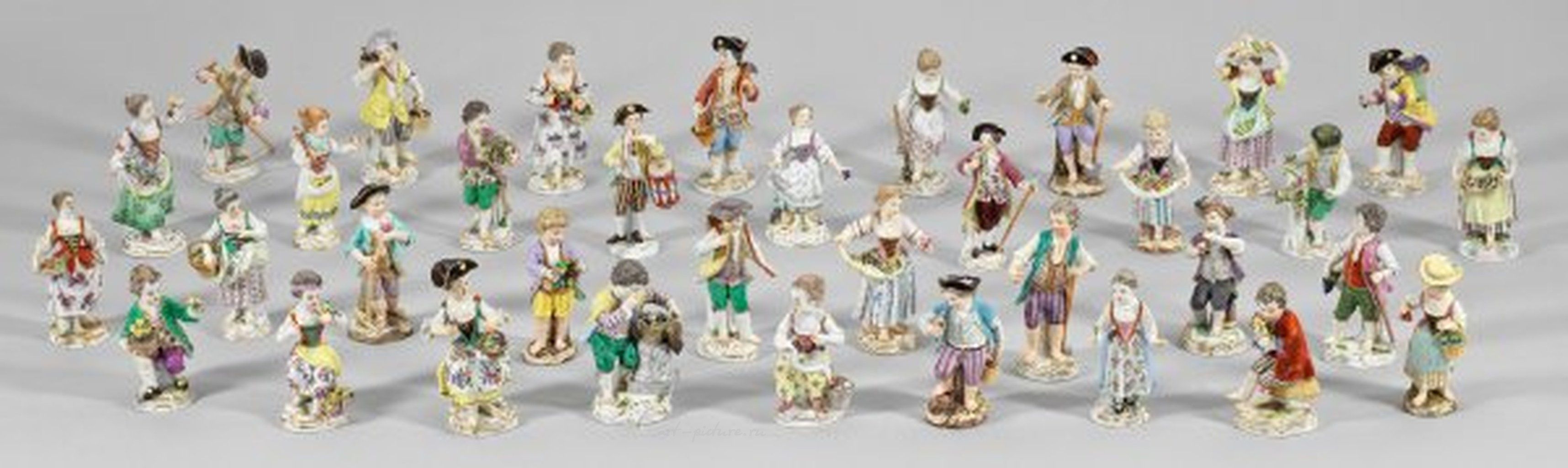 На поддоне в стиле рококо расположены сидящие или стоящие юноши и девушки, одетые в рококо с яркими узорами и частично украшенные кружевом с золотой отделкой, выступающие в роли садовников, виноделов и пастухов. Они сопровождаются различными атрибутами, такими как корзины с цветами и гроздьями, пастушьей тростью, винным бочонком и различными инструментами, включая волынку или флейту, а также разными животными, включая овец и птиц. Полихромная роспись украшена золотой отделкой. Возможно, авторами работ являются Иоганн Йоахим Кёндлер и Мишель Виктор Асье, около 1740 или 1778/79 года. Частично неизвестные или восстановленные; на маркировке имеются пересекающиеся мечи. Высота колеблется от 10 см до 14 см. "Любовь к природе" отражается в ландшафтных садах и оранжерее щедро оформленных представительных замков Европейских княжеских дворцов XVIII века. Во дворцах также занимались виноделием и возделывали фруктовые плантации. Этот глубокий интерес находит отражение в фигурах садовников, пастухов и виноделов, созданных моделистом Мейсенской фабрики Иоганном Йоахимом Кёндлером (1706-1775) и его сотрудником Мишелем Виктором Асье (1736-1799) в различных сериях детей-садовников. См. каталог Мейсенской Государственной фарфоровой мануфактуры, фигуры I, Дети-садовники. Обширная коллекция из 71 фигуры садовников, моделированных Й. Й. Кёндлером и М. В. Асье. Частично имеются незначительные сколы/восстановления. Маркировка пересекающимися мечами. Мейсен. XIX и XX век.