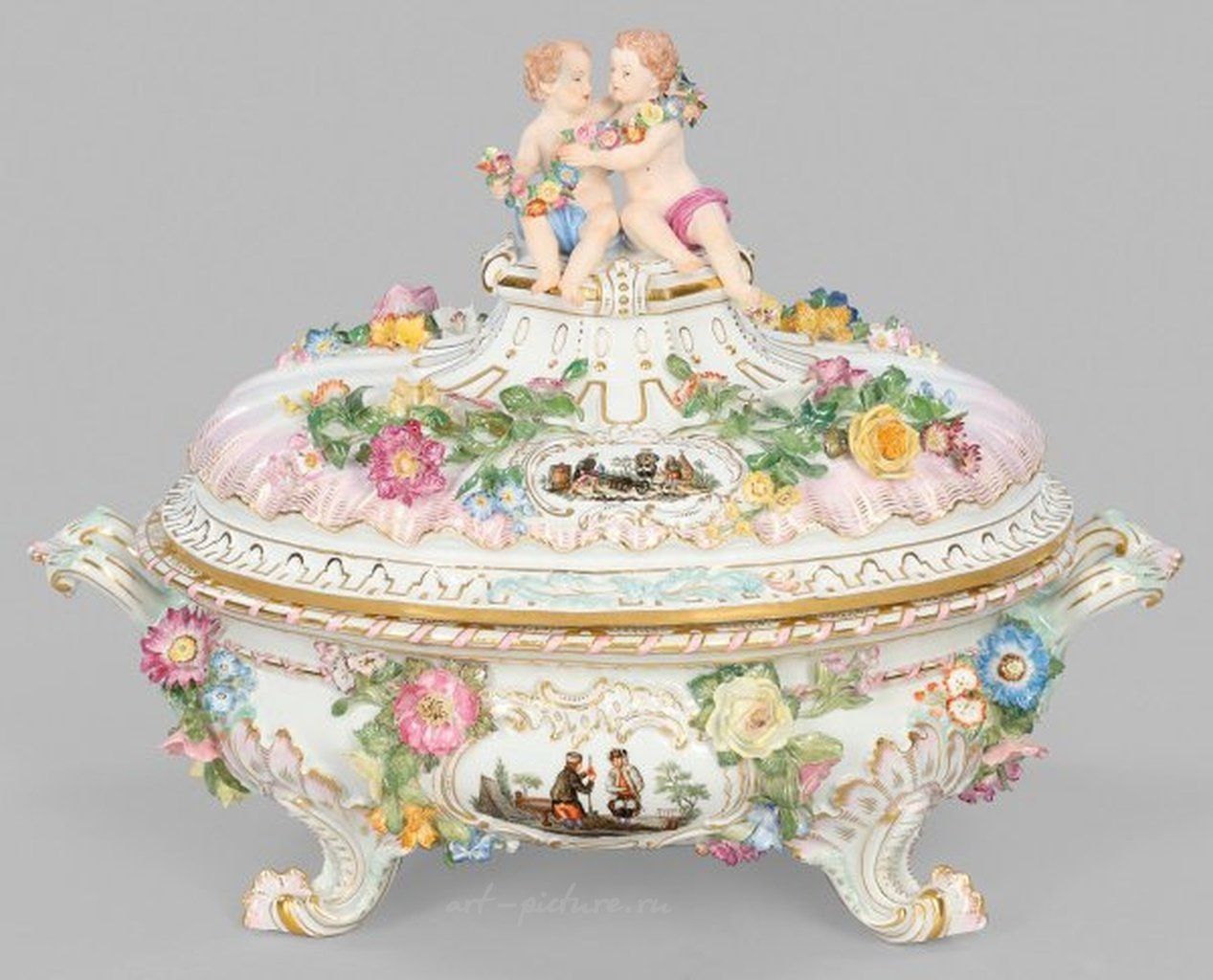 Великолепная фарфоровая супница с четырьмя сильно рельефно-скульптурными ножками, несущими выпуклое овальное тело со скошенной кромкой. Стороны с ручками в форме сердца. Куполовидная крышка с рельефным украшением ракушкой и подобной пьедесталу кнопкой. Наверху, как завершающий элемент, пара купидонов с гирляндой цветов. На обеих сторонах корпуса и крышки ракульные табакерки, окруженные щедро украшенными цветочными лозами, украшены живописными изображениями саксонских горняков в ландшафте с грудами камней и бочками, занятыми различными видами деятельности. Прекрасная полихромная роспись с богатыми золотыми деталями. Окружающие, рельефно-украшенные барбеты и канатные границы. В зеркале – прекрасная овальная медальонная арабеска из листвы и ленточной работы. Неопознанные реставрации. Мечевая марка. Высота 29 см. 37 см х 23 см. См. Фабиан, Мейсенский фарфор с мотивами горнорабочих, стр. 60 и далее. Великолепная фарфоровая террин с фигурными сценами из жизни саксонских горняков. Незначительно восстановлено. Марка в виде скрещенных мечей. Мейсен. Конец XIX века.