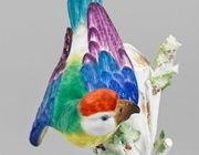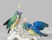 Поднятый, украшенный пластиковыми цветами и листьями, скалистый пьедестал. Усевшаяся на прочной ветке попугай с рельефно украшенным, ярким оперением. Полихромная живопись. Возможно, работа Эрнста Огуста Лойтерица, примерно 1849-1851 годы. Модельный номер Z 49. Меч в знаке. Высота 27 см. Сравнить с каталогом Государственной фарфоровой мануфактуры Мейсен "Цветные птицы", Z 49. Большая фарфоровая фигура попугая на стволе. Знак пересекающихся мечей. Мейсен, примерно 1935-1945 годы.