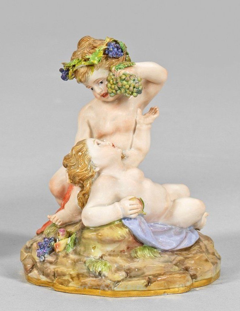 На высоком скалистом пьедестале лежит девочка с яблоком, а рядом сидит мальчик с венком из виноградных листьев, как мальчик-Бакх. Полихромная живопись с позолоченным контуром. Возможно, работы Генриха Швабе, 1881 год. Модель под номером L 165. Незначительные повреждения/восстановление; клеймо перекрещенных мечей. Высота 11 см. Модель выпускалась в двух вариантах. Как подвеска, Швабе также разработал модель детской пары с четками. Фарфоровая группа фигур детской пары с виноградными лозами. Незначительные сколы/восстановления. Клеймо перекрещенных мечей. Мейсен. Около 1900 года.