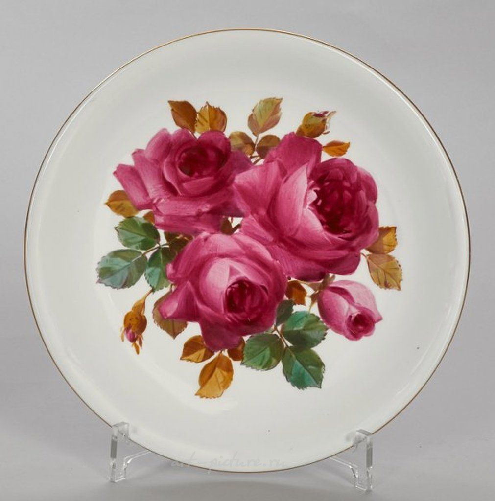 В стиле профессора Юлиуса Эдуарда Браунсдорфа - круглая форма с гладким золотым ободом. В углубленном зеркале разноцветный букет из красных лепестков роз в мягкой, импрессионистской и воздушной живописи. Минимальное состояние - серьезные следы. Диаметр 24 см. Искусный рисунок отражает влияние профессора Юлиуса Эдуарда Браунсдорфа. С 1862 года он работает флористом в Майссене и развивает, в конце 19 века, типичный импрессионистский, блестящий и мягкий стиль. Фарфоровый тарелка с узором из роз в стиле профессора Юлиуса Эдуарда Браунсдорфа. Незначительные сколы. Маркировка креста и меча. Майссен. Около 1900 года.