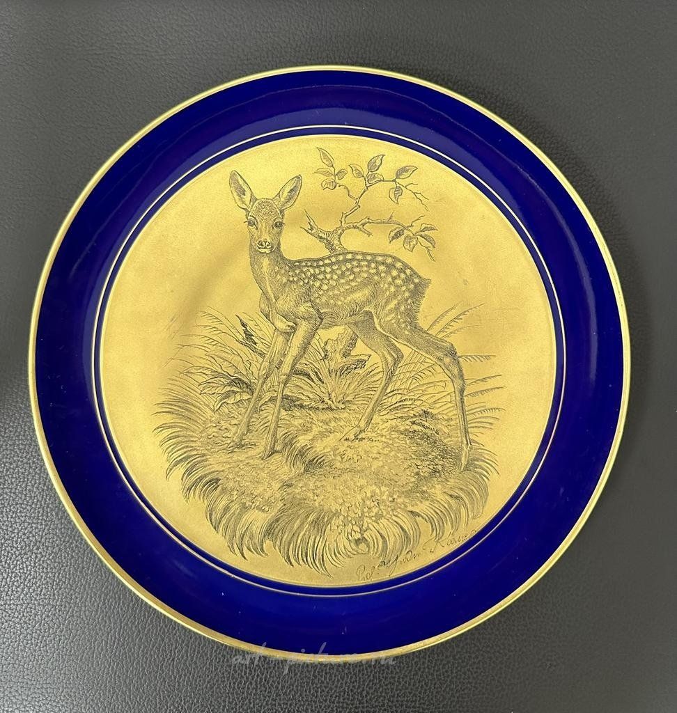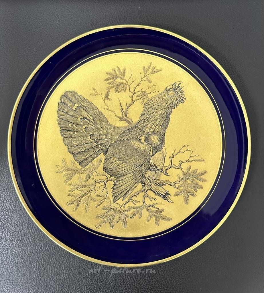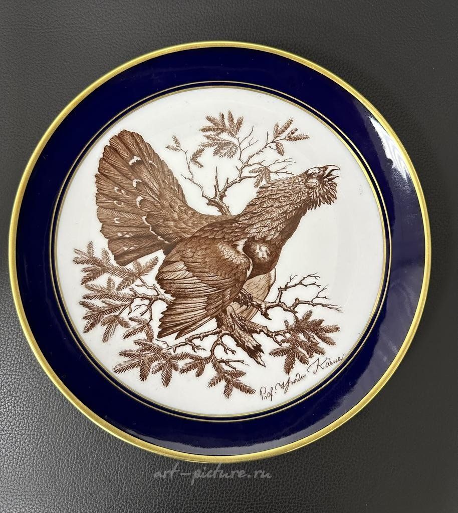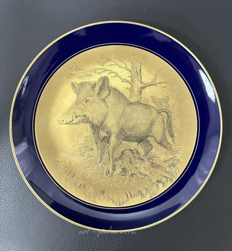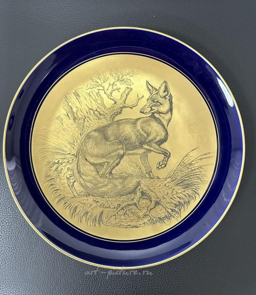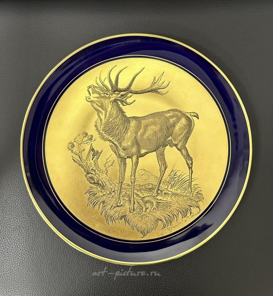 Настенная тарелка Теодор Кернер (Theodor Kärner) выпущенная на фабрике Lindner Porzellanmanufaktur (Кюпс, Бавария) с изображением животных. Размер тарелки 250 мм, золотая гравюра на фарфоре, крепление подвеса в ободе. Тарелка в хорошем коллекционном состоянии. Тарелка является частью серии из 12 с охотничьими сюжетами. За несколько лет до своей смерти Кернер, в тесном сотрудничестве с двоюродным братом, гравёром Карлом Найдхардтом, работал над серией из 12 декоративных настенных тарелок «звериной тематики», выполненных в стальной гравюре и фарфоре. Стоймость указана за 1 тарелку!