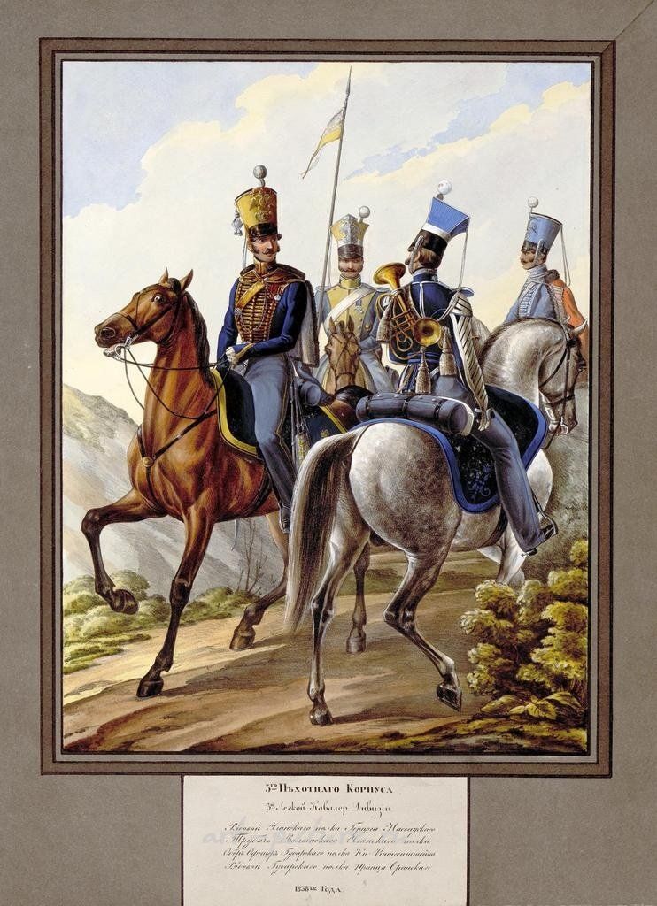 Взглянув на центральную сцену, мы, словно загадочные путники времени, переносимся на поля сражений XIX века, когда вершиной военной моды считалась изысканная униформа, глашатай сражений, восседающий на грациозной лошади. Непередаваемая красота художника, проявленная в каждых штрихах, бережно придаёт жизнь солдатам, которые, как будто, излитые из истории, несутся сквозь потоки времени. Яркая фиолетовая униформа одного солдата, ослепительно выделяющаяся на фоне зеленых оттенков природы, приковывает внимание, вызывая живое ощущение мужества и решимости, что, несомненно, переполняло сердца тех, кто сражался за свой народ.