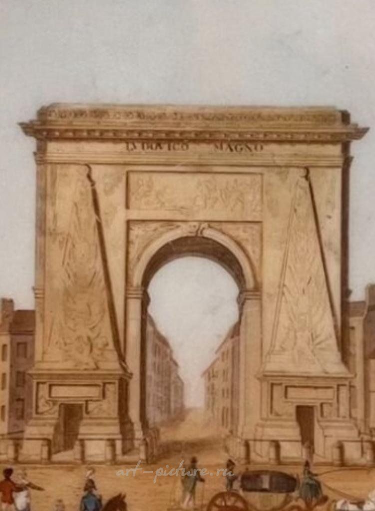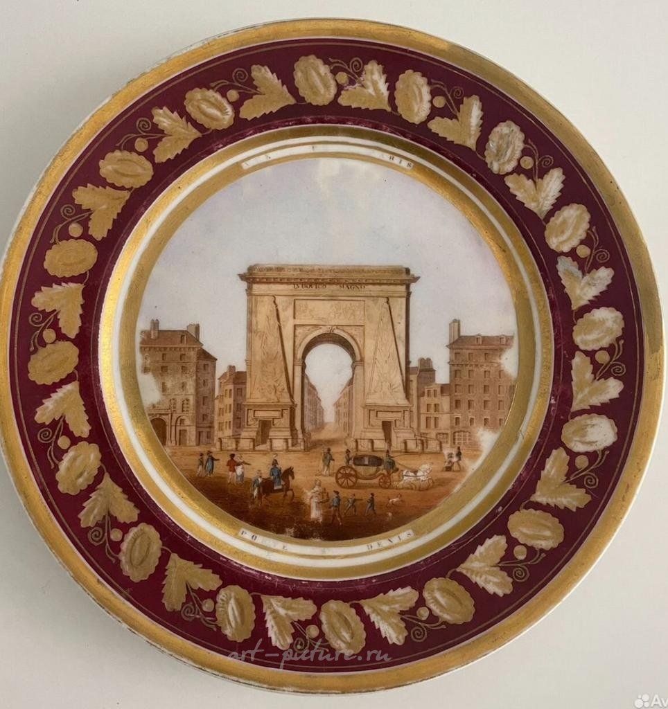 Тарелка с архитектурным пейзажем Париж, первая четверть XIX в. Тарелка из этой же серии хранится в Эрмитаже, ссылка на каталог ниже. Фарфор; роспись надглазурная, золочение, цировка. На зеркале тарелки изображен вид на ворота Сен-Дени снятые напротив, со стороны города (XVIII век) PARIS. - Vue de la Porte Saint-Denis, prise en face, du côté de la Ville (XVIII siecle) Тарелка с архитектурным пейзажем: Вид на ворота Сен-Дени и надписью "VИE DE PARIS/PORTE SAINT DENIS" пер. пол. XIX в. Место создания/школа Франция Датировка пер. пол. XIX в. Материал, техника: Фарфор; роспись надглазурная полихромная, позолота Размер 3х24х24 см