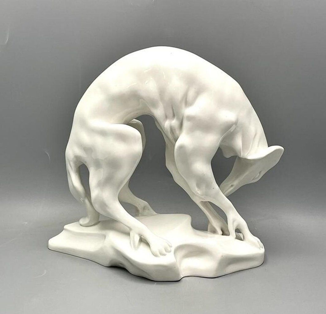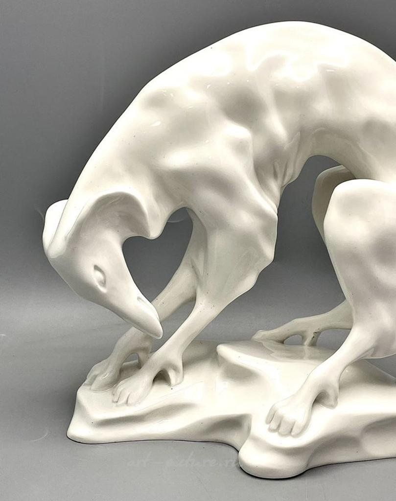 Антикварная статуэтка Арт-деко, Борзая производства Германии, KPM. Материал: фарфор. Размер: высота 22.5см. Борзая (KPM) - Королевская фарфоровая фабрика в Берлине. В 1926-27 годах художник Курт Радтке разработал для KPM несколько исключительно монохромных скульптур животных белого цвета. Исполнение: KPM Berlin в 1928 году, дизайн: Курт Радтке (1895-1978), январь 1926 года. Модель борзой (борзой) Дизайн модели Курт Радтке Запись в модельной книге Январь 1926 г. Номер модели 12514 Налоговый номер 5,7505 Высота 22 см. Фирменный скипетр в подглазурном синем цвете; Печатные марки с годовой буквой y Gamma за 1928 год и песочные часы Borzoi (KPM) Königliche Porzellan Manufaktur (Royal Porcelain Factory) in Berlin. Artist Kurt Radtke designed some exclusively monochrome white animal sculptures for KPM around 1926/27. Execution: KPM Berlin in 1928 Design: Kurt Radtke (1895-1978) in January 1926 Modell Windhund (Barsoi) Modellentwurf Kurt Radtke Modellbucheintrag Januar 1926 Modellnummer 12514 Taxnummer 5,7505 Höhe 22 cm Marken Zepter in Unterglasurblau; Pressmarken Jahresbuchstabe y Gamma für 1928 und Sanduhr Сотрудничество Курта Радтке с Берлинской мануфактурой является прекрасным примером реорганизации КПМ под руководством директора Муфанга с привлечением прогрессивных художников, преимущественно из среды Объединенных государственных школ свободного и прикладного искусства. Радтке посещал скульптурный класс Эдвина Шарфа с 1923 года и вскоре стал его главным учеником. Первые фигурки животных учителя и ученика - первые фарфоровые скульптуры Ара Муфанга - были одновременно внесены в модельную книгу мануфактуры в январе 1926 года. Естественно предположить, что Шарфф рекомендовал Муфанга своему ученику, и директор мануфактуры поручил последнему создать несколько фигурок. В общей сложности в 1926/27 годах Радтке создал девять скульптур животных, все с изображением местных домашних животных. Сельскохозяйственное животное. Стилистически рисунки Радтке представляли собой радикальное отличие от животных, созданных до этого в КПМ, которые в основном были оформлены в натуралистическом стиле и часто продавались в подглазурных цветах. Фигуры Радтке остались без фигур, их тела отличались сильной кремнистостью, и, по крайней мере, борзая, петух и коза демонстрировали отголоски экспрессионистских тенденций. Общим для всех пластических работ являются нерегулярно сформированные естественные основания, в некоторых из которых, вероятно, сыграл свою роль опыт Радтке в качестве декоратора в УФЕ (1922-25). Тот факт, что Курт Радтке смог вдохновить своих современников этими фарфоровыми изделиями, подтверждается тем фактом, что они были представлены на важных национальных и международных выставках (1926 г. в Мюнхене, 1927 г. в Верккунсте и Монце, 1928 г. в Лейпциге). Кроме того, Прусская академия художеств наградила Радтке в 1927 году Большой государственной премией в области скульптуры, что было большой честью для молодого художника, который в то время все еще был учеником Шарфа. К сожалению, художественная карьера Радтке была недолгой, так как он отошел от скульптуры во время нацистского правления и очень успешно работал в сфере разработки промышленных изделий до 1970-х годов. Только в середине 1960-х годов он снова нашел время заняться скульптурой. Kurt Radtkes Zusammenarbeit mit der Berliner Manufaktur ist ein perfektes Beispiel für die von Direktor Moufang betriebene Neuausrichtung der KPM unter Miteinbeziehung progressiver Künstler, vorwiegend aus dem Umfeld der Vereinigten Staatsschulen für freie und angewandte Kunst. Radtke hatte seit 1923 Edwin Scharffs Bildhauerklasse besucht und wurde schon bald Meisterschüler des Künstlers. Die ersten Tierfiguren von Lehrer und Schülerdie ersten Porzellanplastiken der Ara Moufang übe