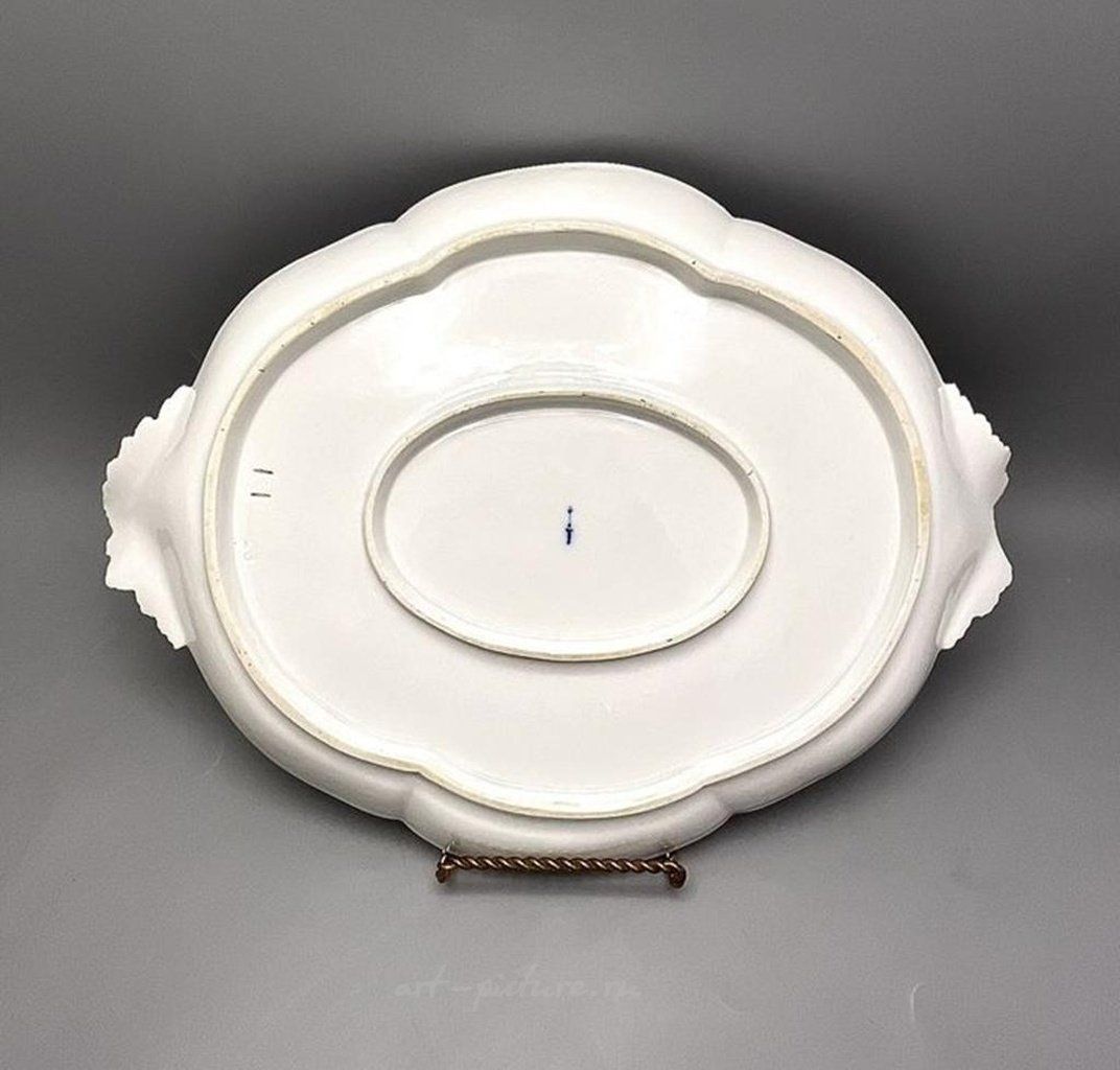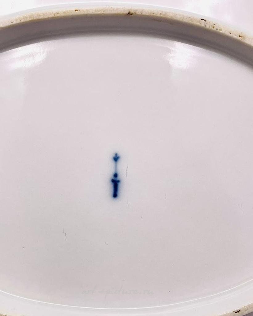 Поднос овальный Gotzkowsky 18 век. Мастерская КПМ модель около 1765 г., Гоцковского, тончайшая роспись пурпуром, позолота Номер модели 122 Модель лотка овального размера; 38,8 × 27,9 см .; Скипетр в подглазурно-синем цвете Modellentwurf KPM-Werkstatt Modellbucheintrag um 1765, die Form bereits bei Gotzkowsky Modellnummer 122 Modell, Taxnummern, Maße und Marken Tablett oval Größe; 38,8 × 27,9 cm; Zepter in Unterglasurblau