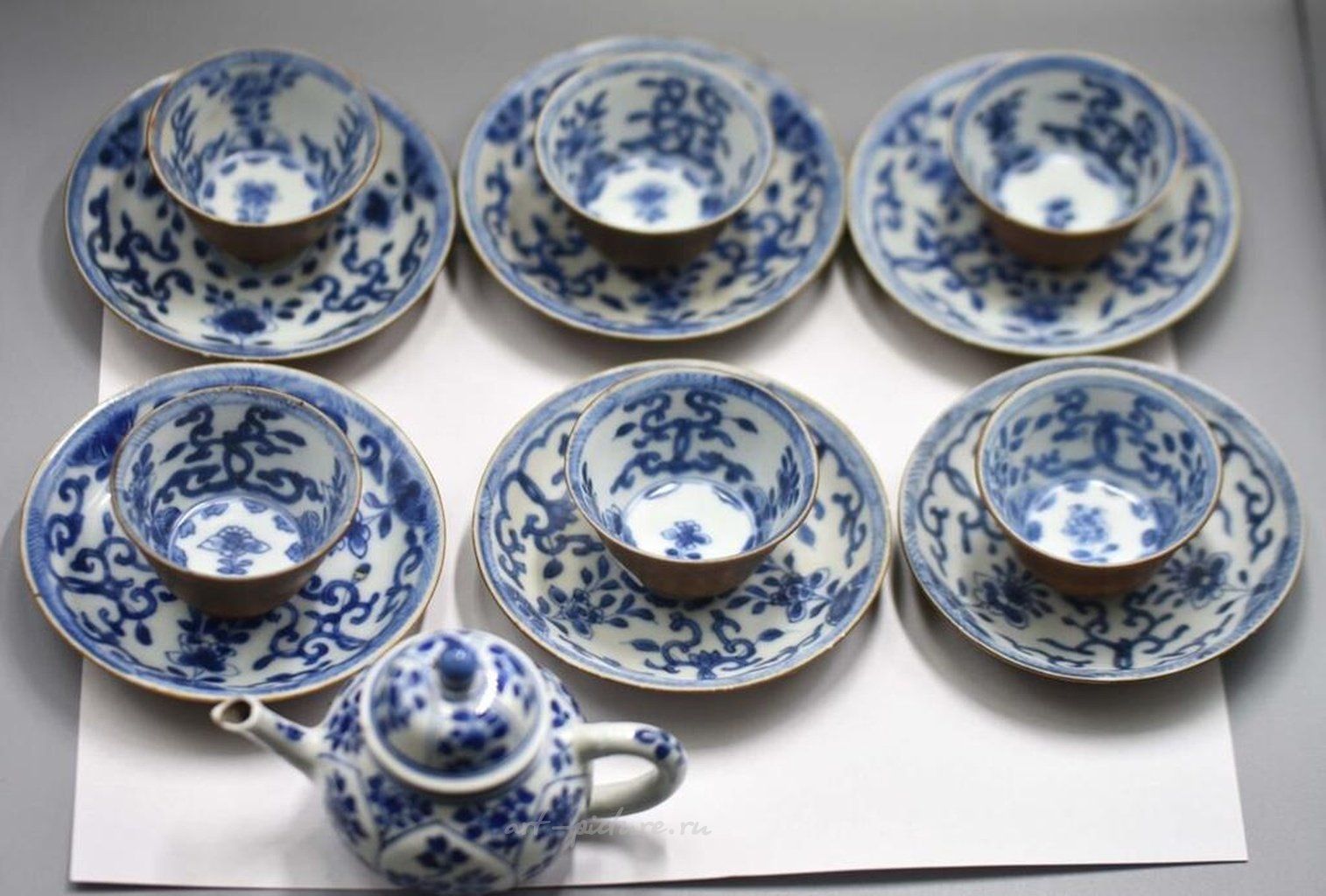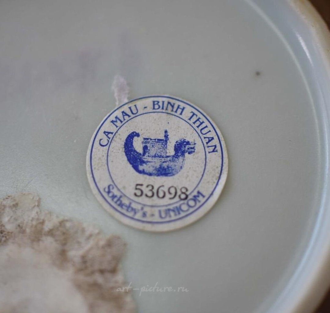 КИТАЙСКИЙ ИМПЕРАТОРСКИЙ ФАРФОР ИЗ ГРУЗА КА МАО. 18 век. Чашка с блюдцем для чая «Лиственный узел» Диаметр чашки - 6,8 см Диаметр блюдца - 11 см Приблизительно 1725 г. Внутренняя часть блюдца и чашечки декорирована кобальтовым рисунком с изображением цветов вишни, разделенных узлами переплетающегося орнамента из лиственных растений. Тулова предметов покрыты глазурью цвета «кофе с молоком». Фарфор такого качества на мировом антикварном рынке встречается чрезвычайно редко и, учитывая его происхождение, имеет исключительную историческую и культурную ценность. Этот китайский фарфор начала 18 века был приобретен на аукционе Sotheby's, Made in Imperial China: Chinese Export Porcelain From the Ca Mau Shipwreck, Circa 1725, в январе 2007 года в Амстердаме. Цена указана за 6 чашек, 6 блюдец и чайник.
