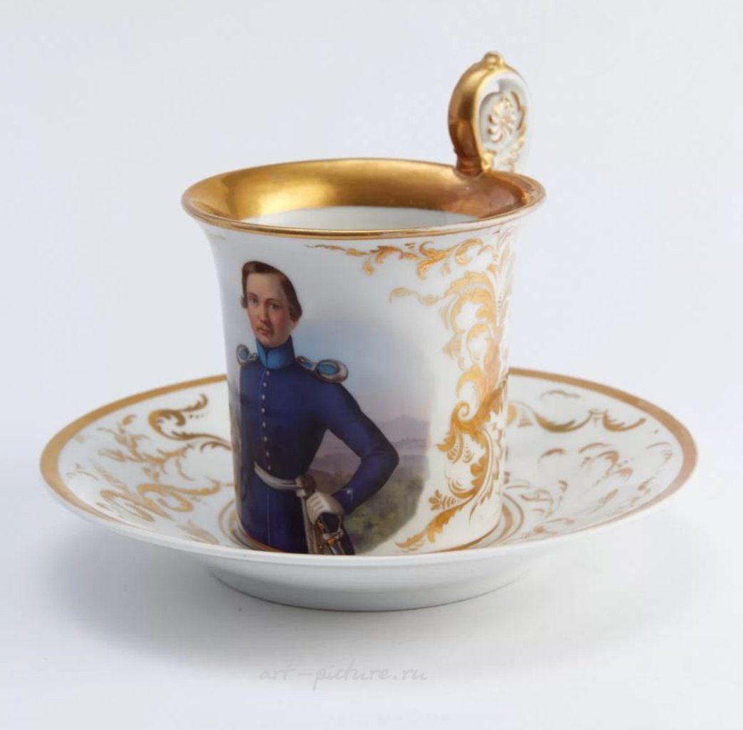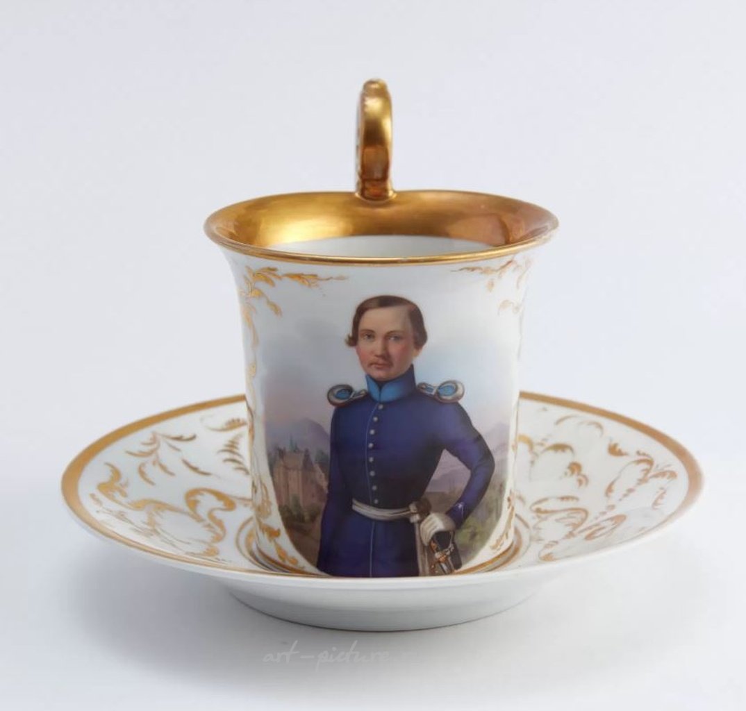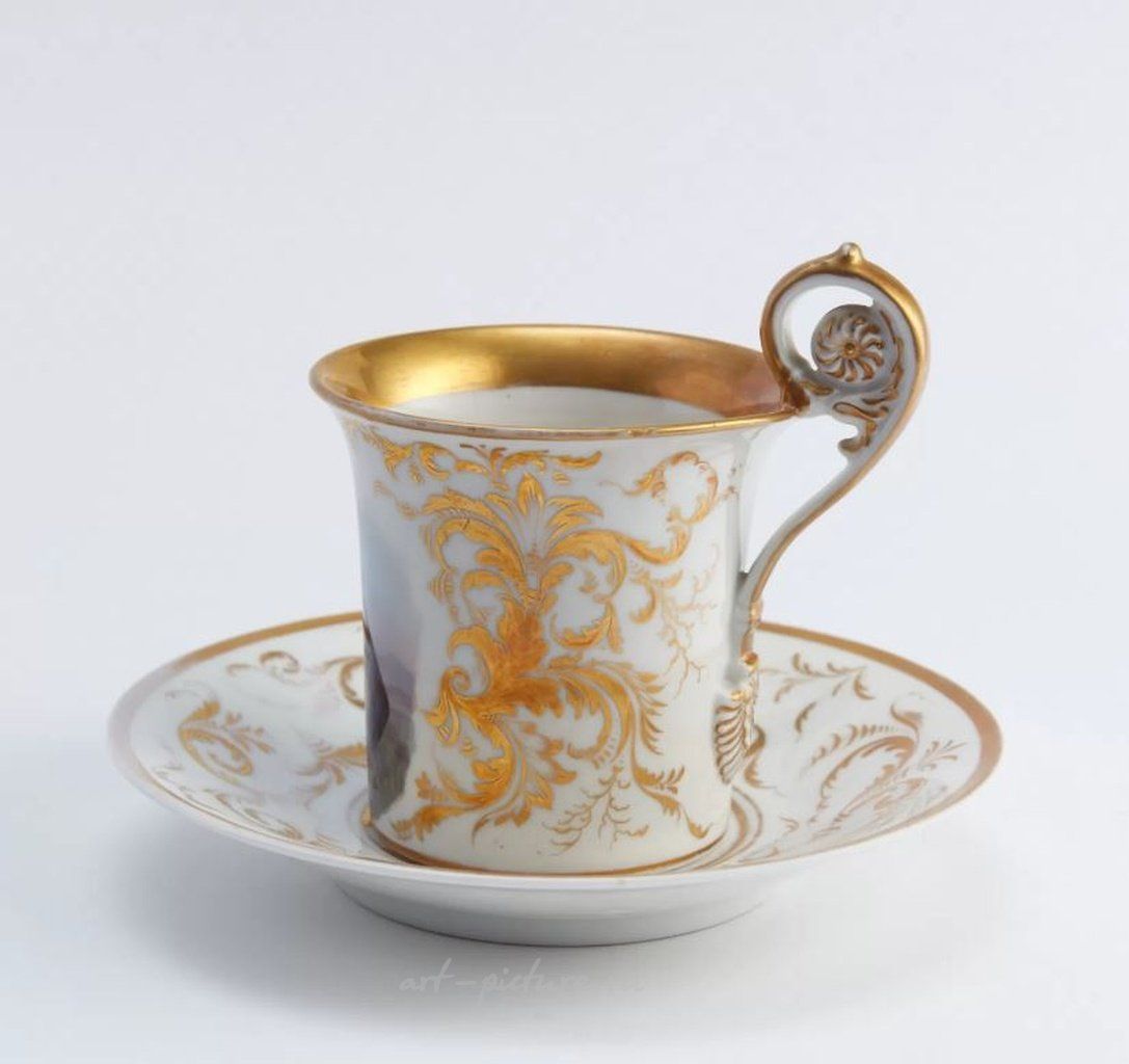 Высокопрофессиональная живопись на фарфоре. Размер: объем чашки 250 мл, высота чашки с ручкой 12 см, высота чашки без ручки 9 см, диаметр чашки 9,5 см, диаметр блюдца 17,5 см Материал: Фарфор Возраст: 1870-1879 Состояние: хорошая сохранность, без повреждений и реставрации