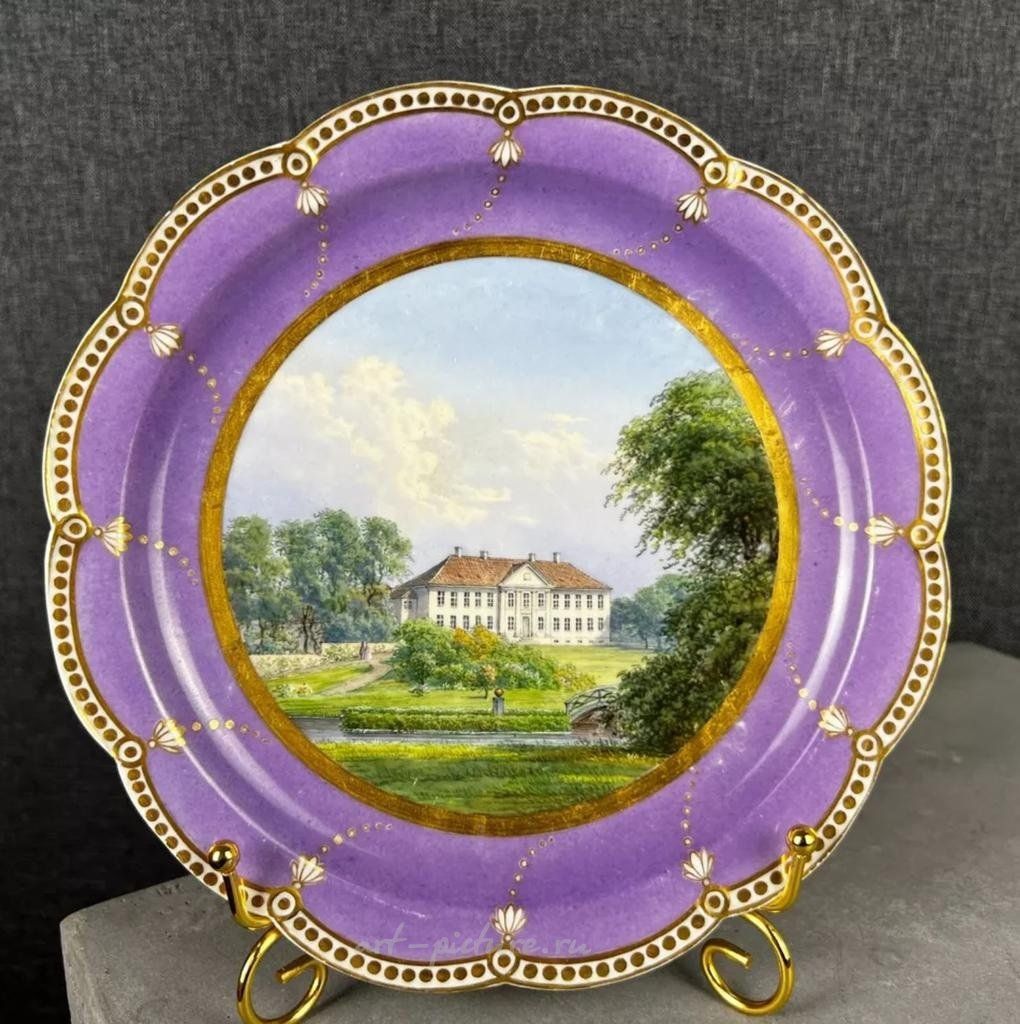 Топографическая тарелка Royal Copenhagen, изображающая усадьбу Store Frederikslund, принадлежавшую датской аристократической семье Kammerherre Grevenkop-Castenskiold. На 1 тарелке написано: «Store Frederikslund, Kammerherre Grevenkop-Castenskiold.», подпись B.2. На обратной стороне тарелки также имеются отпечатанные буквы. Диаметр: 21см Изготовлено в 1870 году.