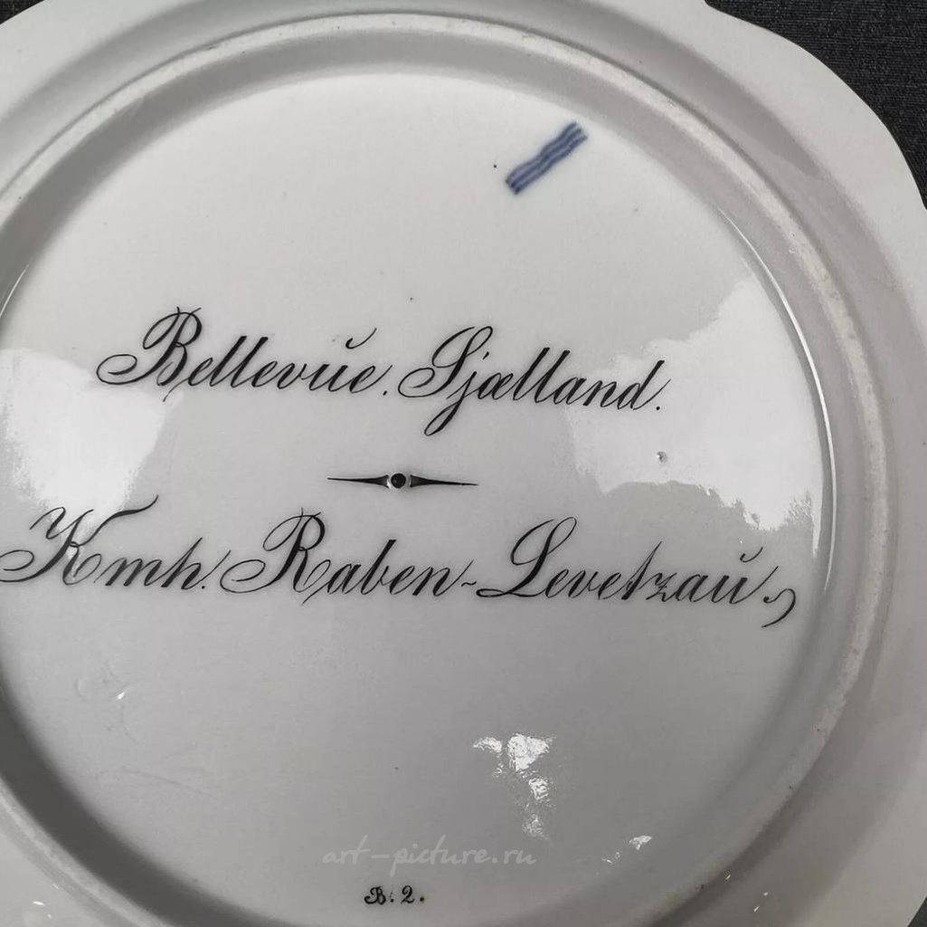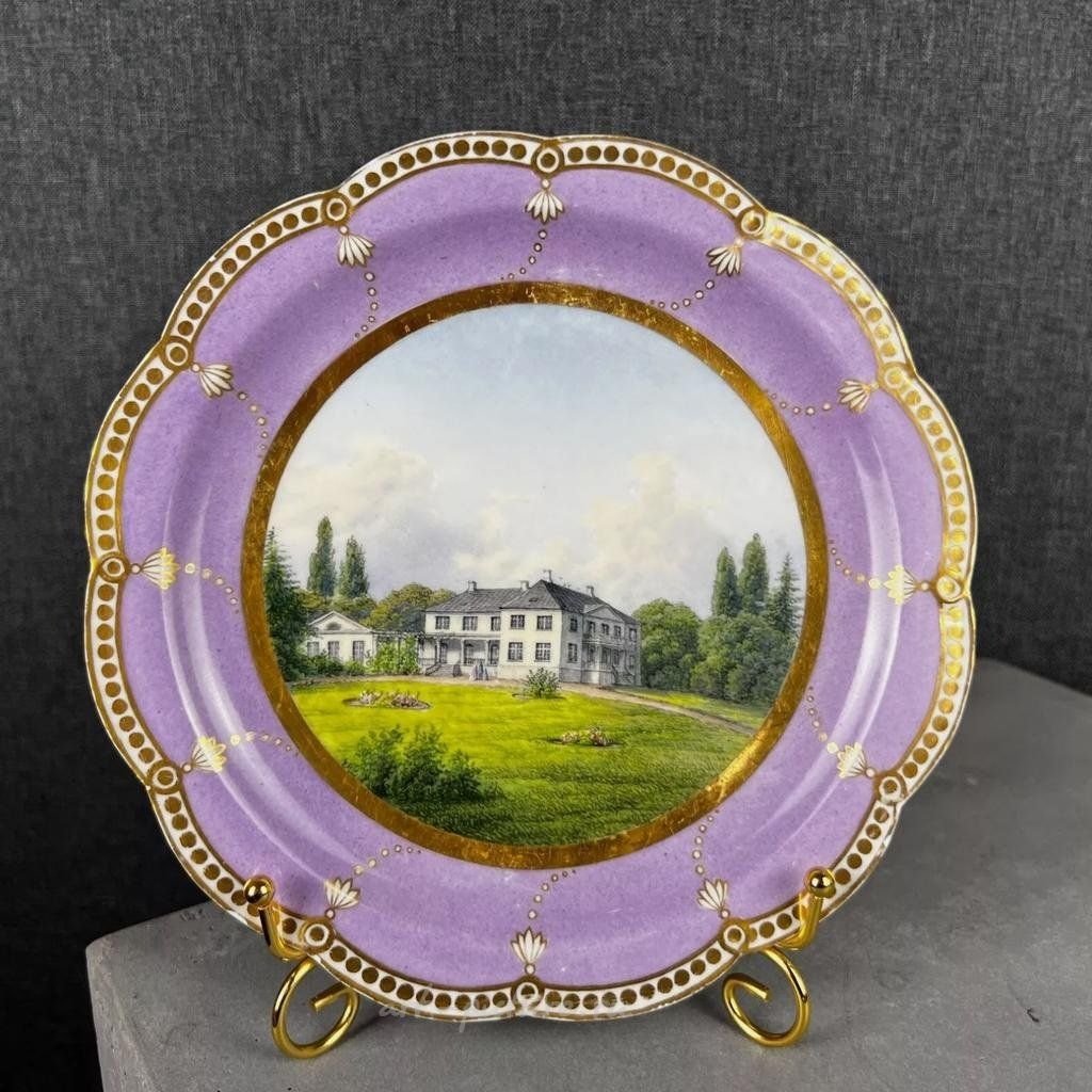 Топографическая тарелка Royal Copenhagen, изображающая усадьбу Store Frederikslund, принадлежавшую датской аристократической семье Kammerherre Grevenkop-Castenskiold. На 1 тарелке написано: «Store Frederikslund, Kammerherre Grevenkop-Castenskiold.», подпись B.2. На обратной стороне тарелки также имеются отпечатанные буквы. Диаметр: 21см Изготовлено в 1870 году.