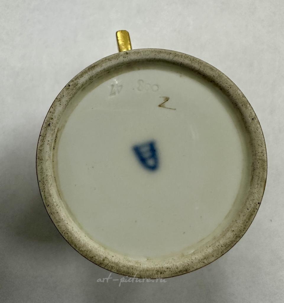 Чашка; фарфор, крытьё бирюзовой краской, орнаментальная роспись золотом с рельефным мастичным декором, лепнина, позолота. По тулову полихромная живописная миниатюра "Vue de la Grotte des Chevres sur l'Etna (вид Грота серны близ Этны)", как гласит надпись над изображением в прямоугольном мастичного золота картуше. Марка "шит"- подглазурный кобальт; шифр года производства "800" - в тесте. Вена, Аугартен, Императорская фарфоровая мануфактура, 1800 год. Состояние: превосходное!