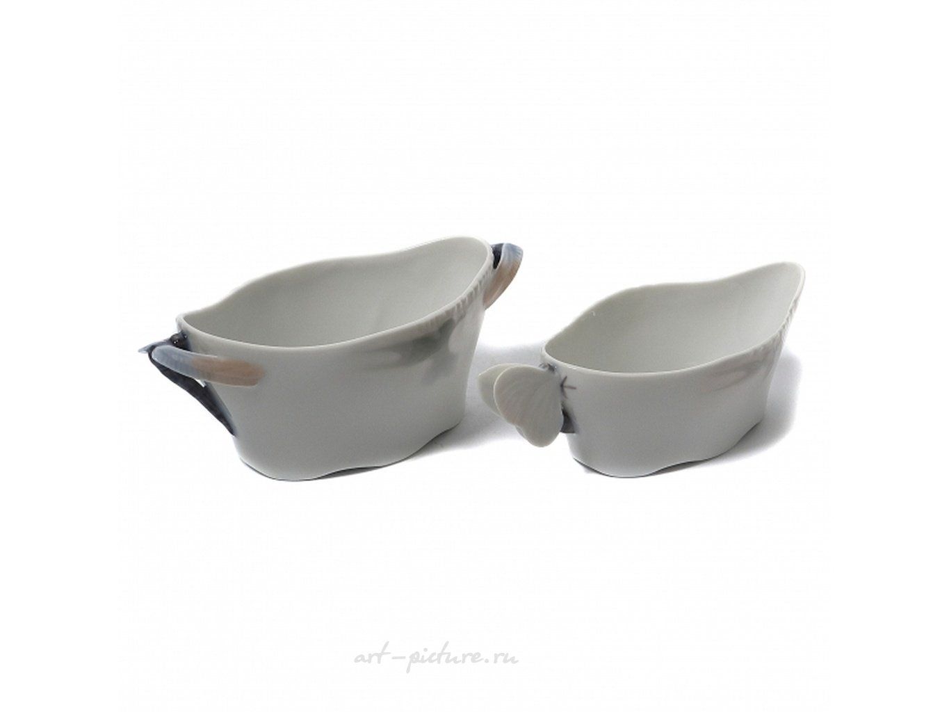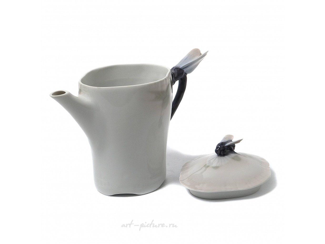 Фарфоровый кофейный сервиз, 3 предмета. Модерн, Арт нуво. Декорированные бабочками и с ручками, выполненными в виде стрекоз. Ручная подглазурная роспись. Из серии "Сон в летнюю ночь". Дания, г. Копенгаген, Royal Copenhagen, 1985-1989 гг. Автор: Arnold Krog (годы жизни: 1856-1931; годы работы на фабрике: 1884-1916; c 1885 художественный руководитель фабрики). Дизайн расписи: 72. Номера моделей: 10035, 10037, 10040. Инициалы художников, расписавших предметы: UR, ZV, KJ . Клеймо производителя. Высота кофейника по хватку на крышке: 13 см, размеры верха кофейника: 8,5 х 7 см. Объём: 250 мл. Размеры сахарницы: высота - 5,5 см, максимальная длина (с ручками) - 13 см, ширина - 6,5 см. Высота молочника по носик: 4,3 см, максимальная длина (с ручкой): 13 см, ширина: 5,5 см. Объём: 70 мл. Сервиз первого сорта. Без сколов, повреждений и без реставраций. Porcelain coffee service, 3 pieces. Modern, Art Nouveau. Decorated with butterflies and with handles made in the form of dragonflies. Hand-made underglaze. From the series "A Midsummer Night's Dream". Denmark, Copenhagen, Royal Copenhagen, the 1985-1989. Author: Arnold Krog (years of life: 1856-1931; worked at the factory from 1884 to 1916; since 1885 Artistic Director of the factory). Painting design: 72. Models: 10035, 10037, 10040. Initials of the artists who painted the objects: UR, ZV, KJ . Factory mark. Height of the coffee pot according to the grip on the lid: 13 cm, size of the top of the coffee pot: 8.5 x 7 cm. Volume: 250 ml. Sugar bowl dimensions: height - 5.5 cm, maximum length (with handles) - 13 cm, width - 6.5 cm. Creamer height up to the spout: 4.3 cm, maximum length (with handle): 13 cm, width: 5.5 cm. Volume: 70 ml. Service of the first sort. Without chips, damages and restorations.