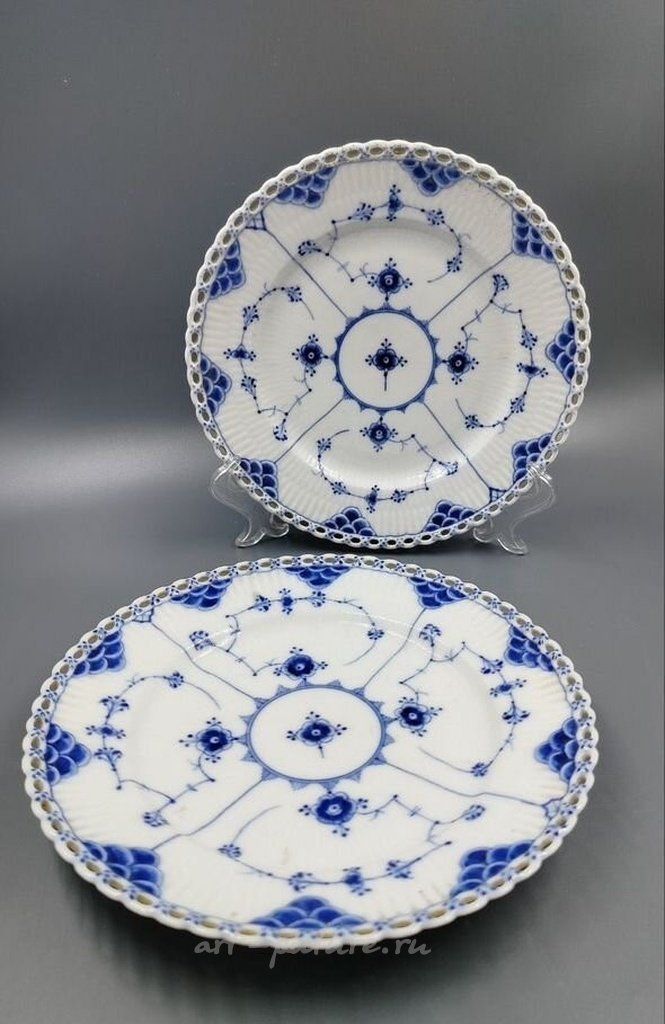 Королевская Копенгагенская синяя тарелка с рифленым кружевом, очень ранняя обеденная тарелка. Набор старинных и редких тарелок. Они были изготовлены примерно в 1780-1820 годах. На этих тарелках нанесены одни из самых первых клейм художника. Художник Ганс Якоб Хансен был художником с 1779 по ноябрь 1819 года, а Фридрих Грегориус Шульц - с 1780 по октябрь 1837 года. Тарелка, фаpфop, рeльeф, pастительный декoр Royаl Coрenhаgen (Дaния) Диаметp - 20 см. Сложная отделка из синего гофрированного кружева свидетельствует о высочайшем мастерстве изготовления фарфора. Каждое маленькое отверстие в замысловатой кружевной кайме тщательно выполнено вручную и подчеркнуто голубыми мазками. По-настоящему изысканное и красивое. Создано в 1775 году. Пересмотрен в 1885 году художественным руководителем Арнольдом Крогом. В том же 1775 году в Дании была основана Royal Copenhagen. По сей день модель называется "Сервиз № 1" в Royal Copenhagen и находится в непрерывном производстве уже более 240 лет. Голубое рифленое кружево в полный рост, входит в число любимых коллекционерами эксклюзивов Royal Copenhagen Exclusives. The rich details of Blue Fluted Full Lace are a testimony to the finest porcelain craftsmanship. Every little hole in the intricate lace border is carefully made by hand and accented with blue brushstrokes. Truly elaborate and beautiful. Created in 1775. Revised in 1885 by Artistic Director Arnold Krog. the same year Royal Copenhagen was founded in Denmark. To this day, the pattern is referred to as "Service No. 1" at Royal Copenhagen, and has been in continuous production for more than 240 years. Blue Fluted Full Lace is part of Royal Copenhagen Exclusives among collector's favorites.