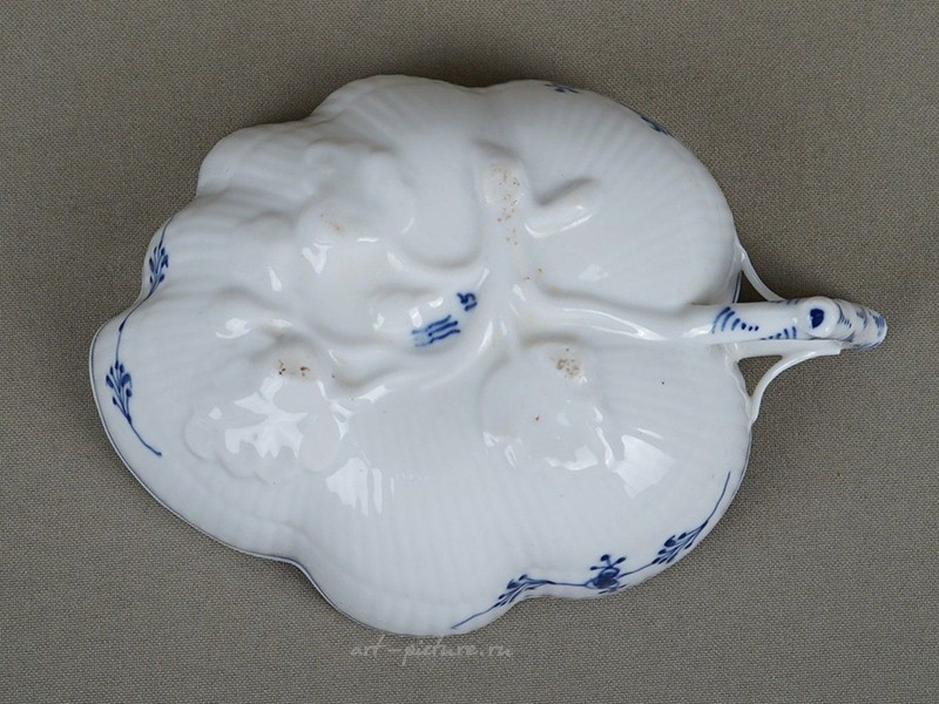 Вазочка в виде Листа, рельефная, фарфор, роспись традиционная, кобальтом . Дания, Royal Copenhagen Blue Fluted Half Lace, длина 14см. Очень редкая форма, выпускалось в начале работы фабрики. Перед вами блюдо Royal Copenhagen с голубыми рифлеными листьями и ручкой. Это редкое и замечательное изделие, такого же размера и дизайна, как и номер 1/149 (это блюдо было изготовлено до введения системы нумерации с голубыми рифлеными листьями примерно в 1894 году). Это блюдо среднего размера (из 3-х) из этих редких и пользующихся большим спросом блюд из листьев. Блюдо изготовлено на фабрике высшего качества и расписано вручную в Дании в конце 1800-х годов, до 1894 года. Оно мастерски расписано художником номер 15. Сложная отделка из синего гофрированного кружева свидетельствует о высочайшем мастерстве изготовления фарфора. Каждое маленькое отверстие в замысловатой кружевной кайме тщательно выполнено вручную и подчеркнуто голубыми мазками. По-настоящему изысканное и красивое. Создано в 1775 году. Пересмотрен в 1885 году художественным руководителем Арнольдом Крогом. В том же 1775 году в Дании была основана Royal Copenhagen. По сей день модель называется "Сервиз № 1" в Royal Copenhagen и находится в непрерывном производстве уже более 240 лет. Голубое рифленое кружево в полный рост, входит в число любимых коллекционерами эксклюзивов Royal Copenhagen Exclusives. The rich details of Blue Fluted Full Lace are a testimony to the finest porcelain craftsmanship. Every little hole in the intricate lace border is carefully made by hand and accented with blue brushstrokes. Truly elaborate and beautiful. Created in 1775. Revised in 1885 by Artistic Director Arnold Krog. the same year Royal Copenhagen was founded in Denmark. To this day, the pattern is referred to as "Service No. 1" at Royal Copenhagen, and has been in continuous production for more than 240 years. Blue Fluted Full Lace is part of Royal Copenhagen Exclusives among collector's favorites. Here is a Royal Copenhagen Blue Fluted Leaf Dish with Handle. This is a rare and wonderful piece, the same size and design as number 1/149 (this dish was produced before the adoption of the blue fluted numbering system around 1894). This is the medium size (of 3) of these rare and highly sought after leaf dishes. The dish is factory first quality, made and hand painted in Denmark in the late 1800s, before 1894. It is expertly painted by painter number 15.