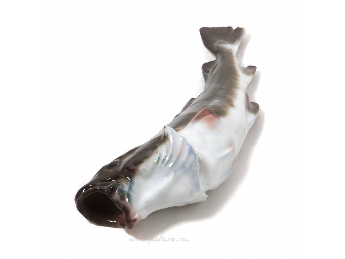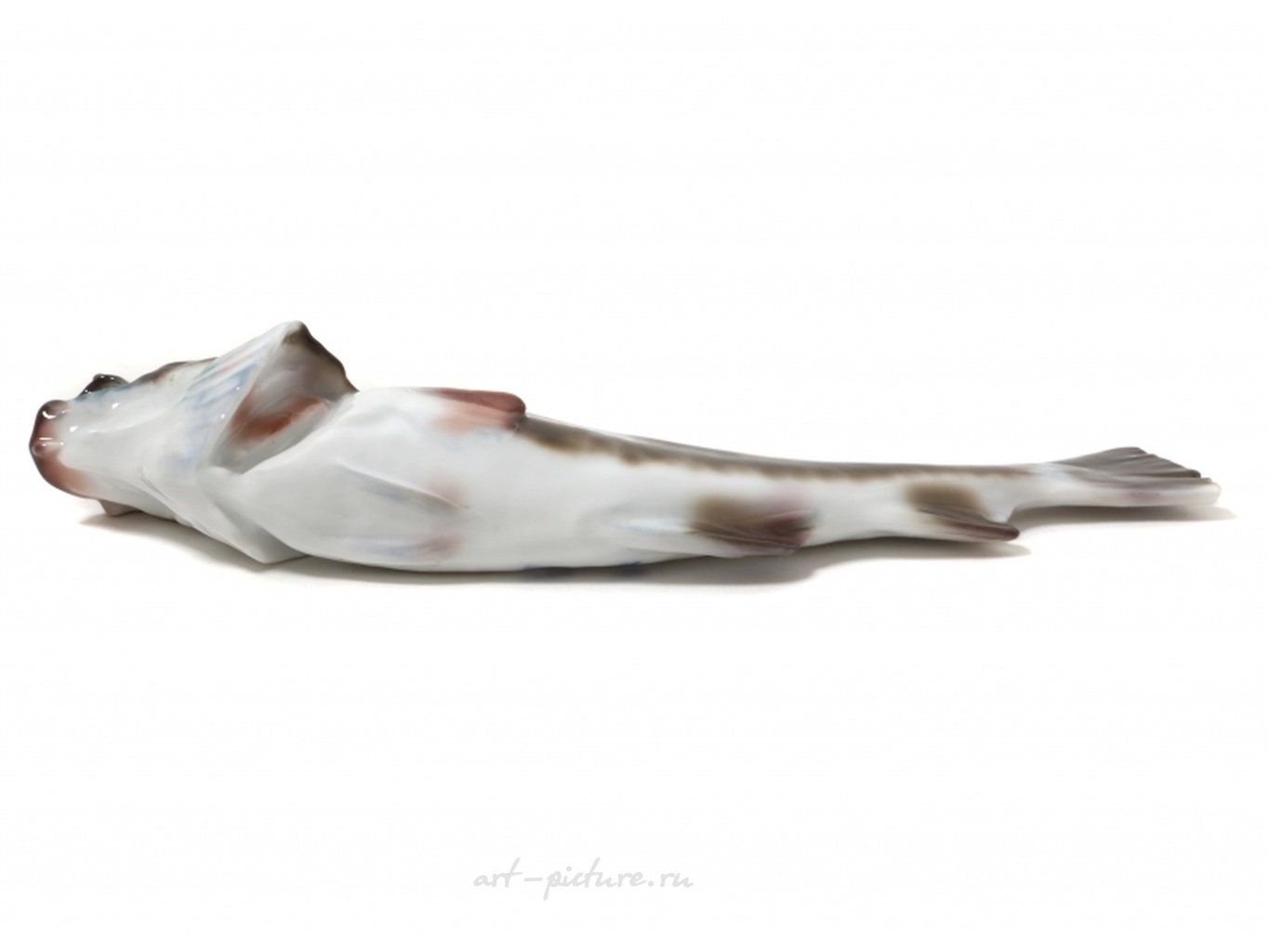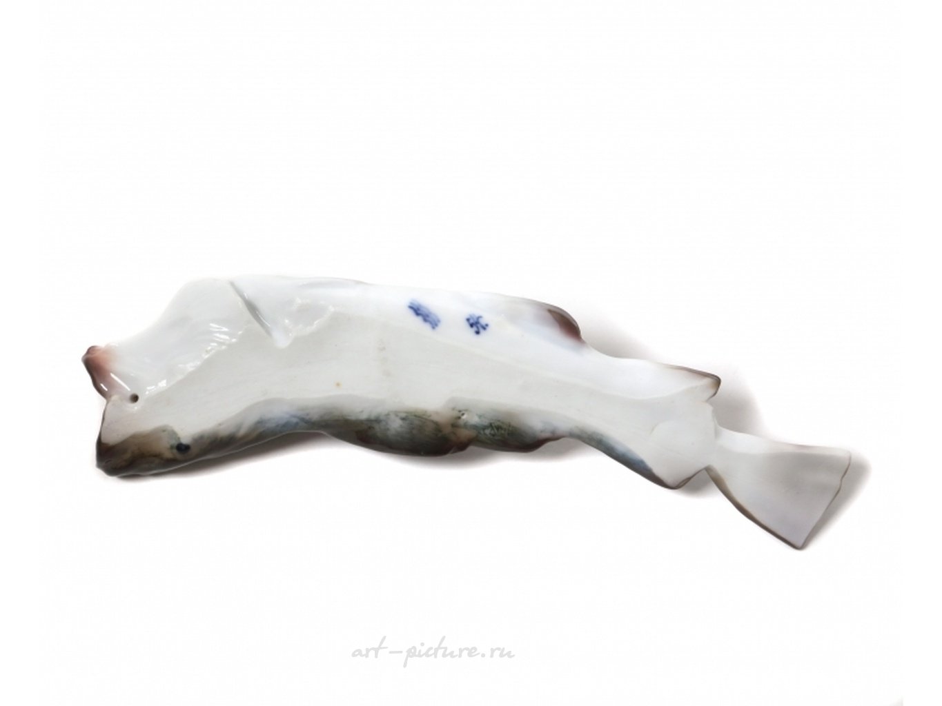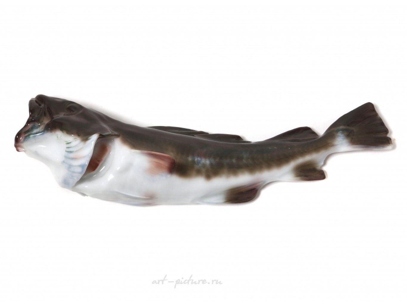 Фарфоровая фигура (статуэтка) "Треска". Фигура подвешивается на стенку. Ручная подглазурная роспись. "Треска с широко открытым ртом" - название фигуры по каталогу Pope. Дания, г. Копенгаген, Royal Copenhagen, до 1893г. Скульптор C.F. Liisberg. Клеймо производителя. Номер модели - 458, производится с 1888 года. "54" - порядковый номер художник J M Lorenz, расписавшего статуэтку, работал на фабрике с 1893 по 1915 год. Длина - 26 см. Статуэтка первого сорта. Без сколов, повреждений и без реставраций. Porcelain figurine "Cod - mouth open wide". Hand-painted underglaz. Denmark, Copenhagen, Royal Copenhagen, 1893. Sculptor C.F. Liisberg. Factory mark. Model - 458. Produced since 1888. "54" - the number of the artist J M Lorenz 1893 - 1915, painted this figurine. Length - 26 cm. Figurine of the first sort. Without chips, damage and restorations. RC_458