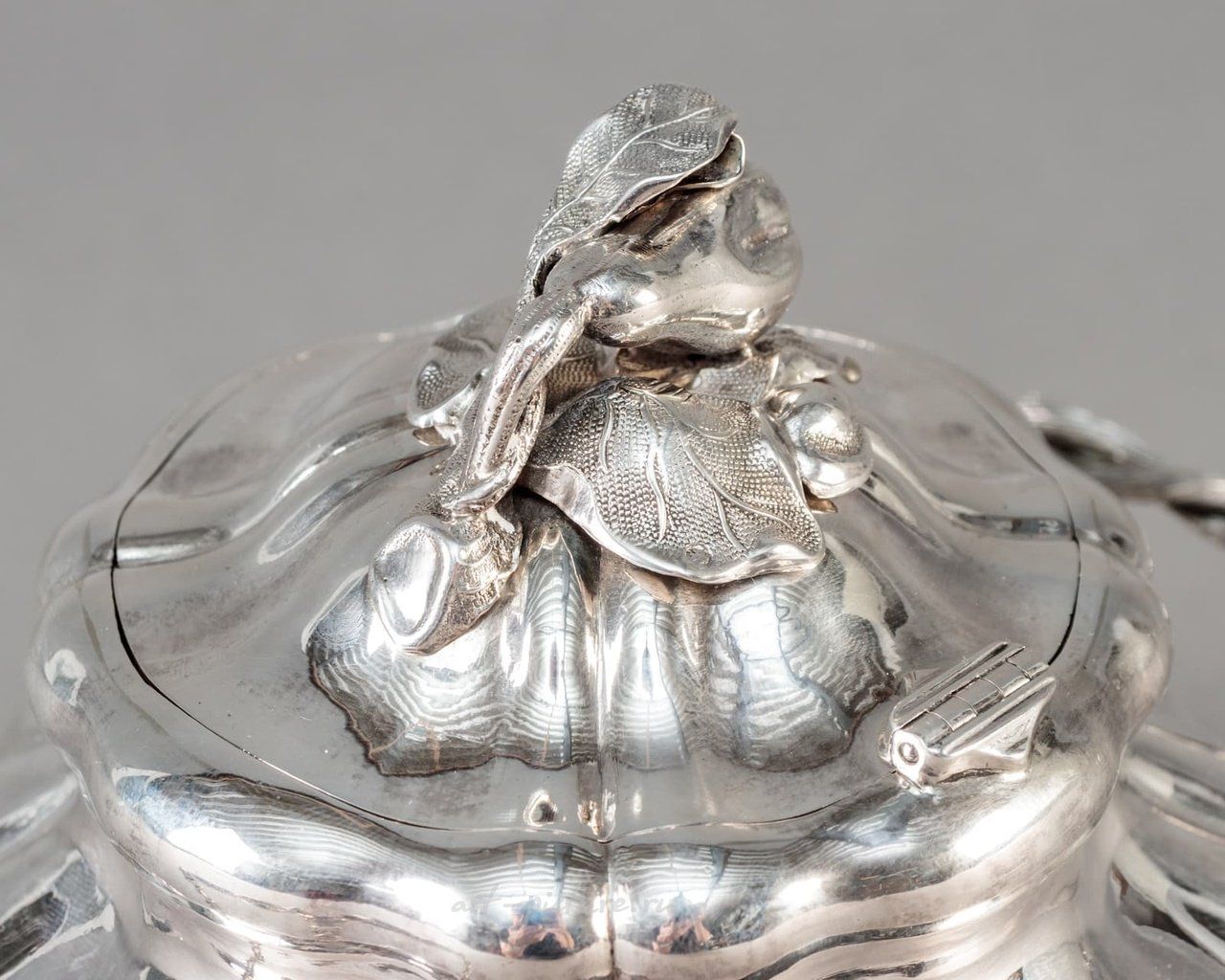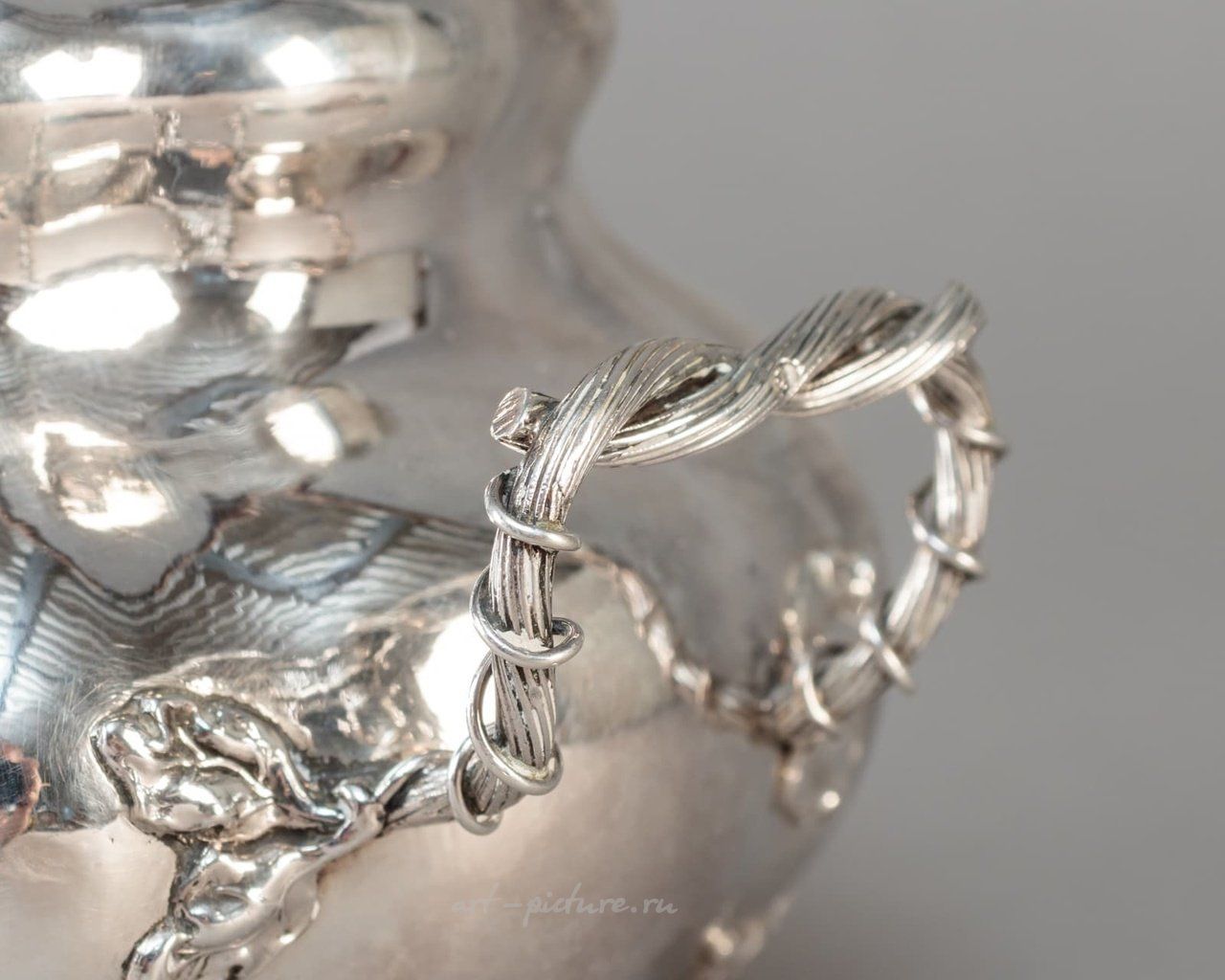 Русская серебряная сахарница с крышкой, Российская Империя ( Россия ), 1855 год, 562 гр, 84 пр, высота по ручку крышки 13,5 см. Материал, техника: серебро, литье, штамповка, прочеканка, пайка. Место происхождения: Российская Империя, Санкт-Петербург, мастерская Сейпеля К.А. Время создания: 1855 год. Вес - 562 грамма серебра 84 золотниковой пробе (= 875 метрической пробе). Сахарница с округлыми боками в форме тыквы, сужающимися кверху в короткое фигурное горлышко. Симметрично с четырех сторон пышность форм изделия усиливают сдвоенные грани, начинающиеся от краев сахарницы и доходящие практически до дна. Сахарница установлена на четыре вогнутые ножки, снизу напоминающие звериные лапы, сверху, в местах крепления к тулову, украшенные рельефными пальметтами с асимметричным флористическим узором и элементами рокайлей. Петлеобразные ручки изделия выполнены в виде витой лозы. Рельеф откидной куполообразной крышки идентичен тулову. Хватка на крышке выполнена в виде объемной веточки с плодом. Клейма на изделии: "CAS" - клеймо с инициалами мастера. Пробирные российские клейма, используемые до 1899 года: "AM" - инициалы пробирного мастера Митина Александра Николаевича, 1842-1877 гг. Цифра "1855" указывает год клеймения. Цифра "84" удостоверяет, что изделие выполнено из серебра 84 пробы. "Два якоря, положенных накрест" - клеймо Петербургского пробирного управления. Заключение: Представленная сахарница являет собой яркий образец изделия, выполненного в стиле рококо, весьма излюбленного русскими ювелирами 19 века. Несмотря на новые веяния в искусстве, этот утонченный европейский стиль с его тяготением к чувственным плавным формам, пышным растительным орнаментам и асимметрии всегда оставался во внимании отечественных мастеров. Декор и техника исполнения изделия не противоречат его датировке. Сохранность изделия квалифицируется как хорошее.