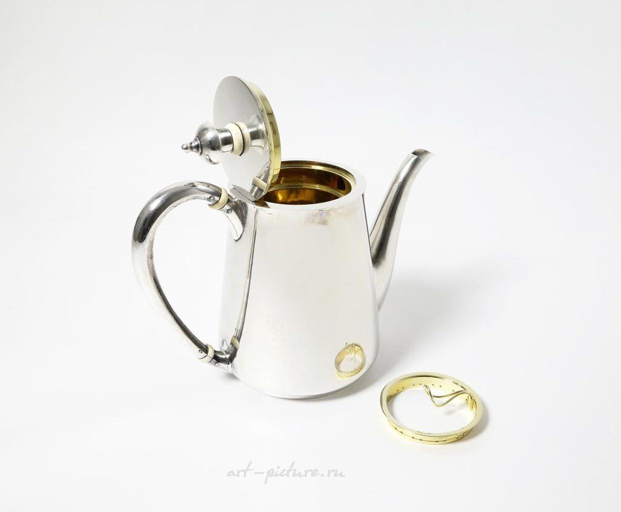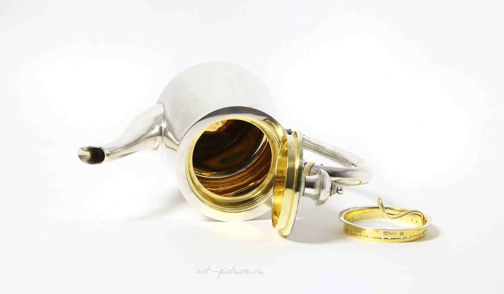 Серебро, из которого он изготовлен, отливает мягким светом, а внутренняя золотистая отделка придаёт ему ощущение роскоши и уюта, как будто даже самые деликатные чая в этот момент заполняют чайник своими утонченными ароматами. Каждый элемент дизайна, каждая плавная линия и изогнутый носик этого чайника — настоящая поэзия, оставляющая след в сердцах тех, кто соприкасается с его формами.