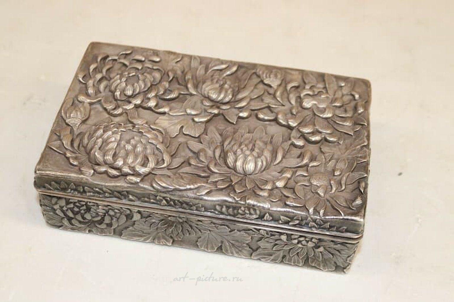 Эта шкатулка фантастически украшена цветочным орнаментом, но тут, как вы совершенно верно заметили, можно и переборщить. Хризантемы, с их рельефной детализацией, создают те самые текстурные эффекты, которые делают изделие очень выразительным, но уводят наш взгляд в изобилие деталей, что иногда не дает увидеть ту самую суть — функциональность и красоту в простоте. Все эти детали, возможно, хотелось бы упростить и адаптировать к современным требованиям эстетики, ведь зачастую "меньше — лучше".