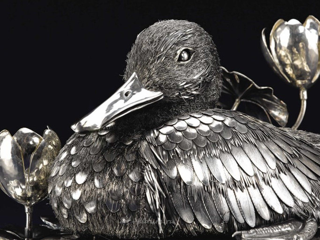 An Italian Silver Centerpiece Mario Buccellati, Rome, Italy Twentieth Century Silver Marks: M BUCCELLATI 925 13.75 inches long x 10.5 inches wide x 6.25 inches high 29.72 Troy ounces ITALIAN SILVER MODEL OF A DUCK Buccellati, Mario (Italian, 1891-1965) This wonderfully realistic model of a duck has been crafted with the utmost precision: modelling a sitting duck, the figure utilises many fine pieces of silver wire to resemble hair around the bird's head and chest. The duck's wings and tail have been crafted with wider, engraved strips of silver which have been shaped to resemble feathers. The bird's beak and eyes have been shaped from solid silver. The duck is shown sitting down and looking up, with its neck resting on its back. The piece is made in the style of Mario Buccellati (Italian, 1891-1965), the famed Italian jeweller who was known, among other things, for his intricate, beautiful animal sculptures. This is an exquisite piece which is the result of skillful craftsmanship.