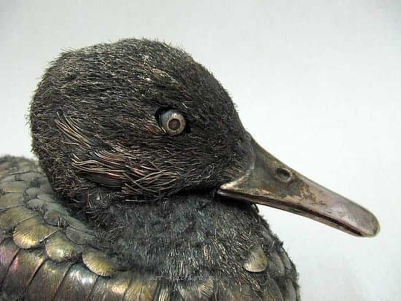 Согласен, что детали — это ключ к восприятию такой работы. Каждое перышко, даже клюв, проработаны с невероятной тщательностью. Я всегда чувствую, как при взгляде на подобные вещи меня захлёстывает восхищение мастерами, которые смогли так точно передать текстуру и характер утки. Это как если бы они запечатлели момент, который можно увидеть только на природе, а здесь он стал нечто более вечным и статичным.