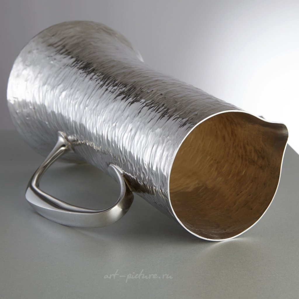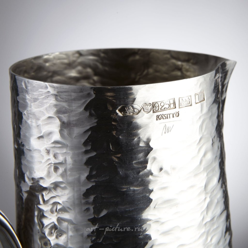 Дизайнерские кувшин и 6 стаканов. Автор дизайна Tapio Wirkkala. Финляндия, 1970-е гг. Общий вес - около 1934 граммов серебра 925 пробы. Высота кувшина - 25 см. Высота стаканов - 7,5 см. Тапио Вирккала (1915–1985) — легендарный финский дизайнер и скульптор, «скандинавский Леонардо XX века», сформировавший облик послевоенного модернизма. Вдохновляясь природой Лапландии, он создавал органичные формы из стекла (культовая серия Ultima Thule для Iittala), фарфора (Rosenthal), дерева и металла, превращая утилитарные предметы в искусство. Ключевые достижения и факты: Стиль: Природные, обтекаемые линии, имитация льда и воды, минимализм. Стекло: Художественный руководитель в Iittala, автор знаменитой «ледяной» посуды Ultima Thule, разработанной около 1968 года. Сотрудничество: Работал с Rosenthal (серии Century, Polo), Venini, Artek (светильники). Признание: Многократный лауреат Миланской триеннале, способствовал мировому признанию финского дизайна. Разнообразие: Проектировал не только посуду, но и ювелирные изделия, мебель, а также финские банкноты (1955 г.). Работы Вирккалы экспонируются в ведущих музеях мира, включая MoMA в Нью-Йорке.