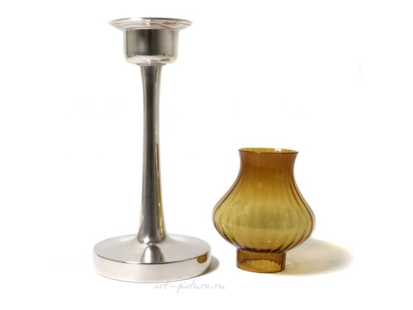 Дизайнерский подсвечник. Стекло, серебро 830 пробы. Дизайнер Eric Löfman (Эрик Лофман). Швеция, г. Уппсала, 1974 год, мастерская Markstroms Guldsmeds (MGAB, годы работы: 1913-1992). Максимальная высота: 32 см, диаметр основания: 11,5 см, диаметр отверстия для свечи: около 5 см. Общий вес серебряной подставки с утяжелением: 450 граммов, серебро 830 пробы. Designer candlestick. Glass, silver of 830 fineness. Designer Eric Löfman. Sweden, Uppsala, year 1974, workshop Markstroms Guldsmeds (MGAB, worked since 1913 to 1992). Maximum height: 32 cm, base diameter: 11.5 cm, diameter for candle: about 5 cm. The total weight of the silver stand with the weight: 450 grams, silver of 830 fineness