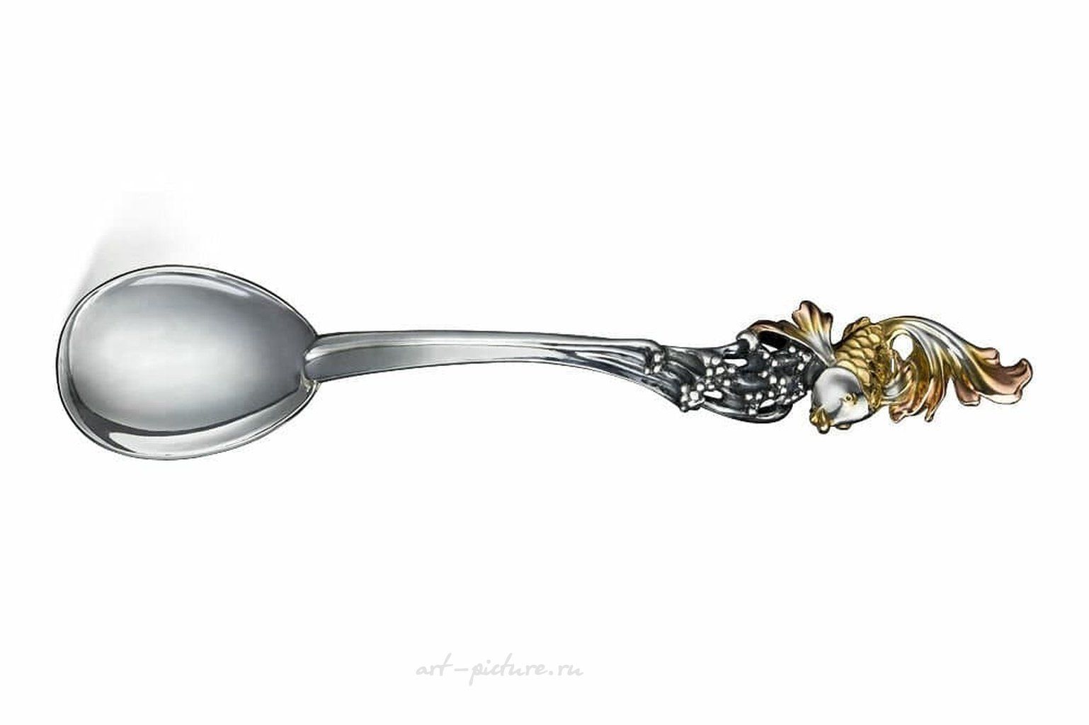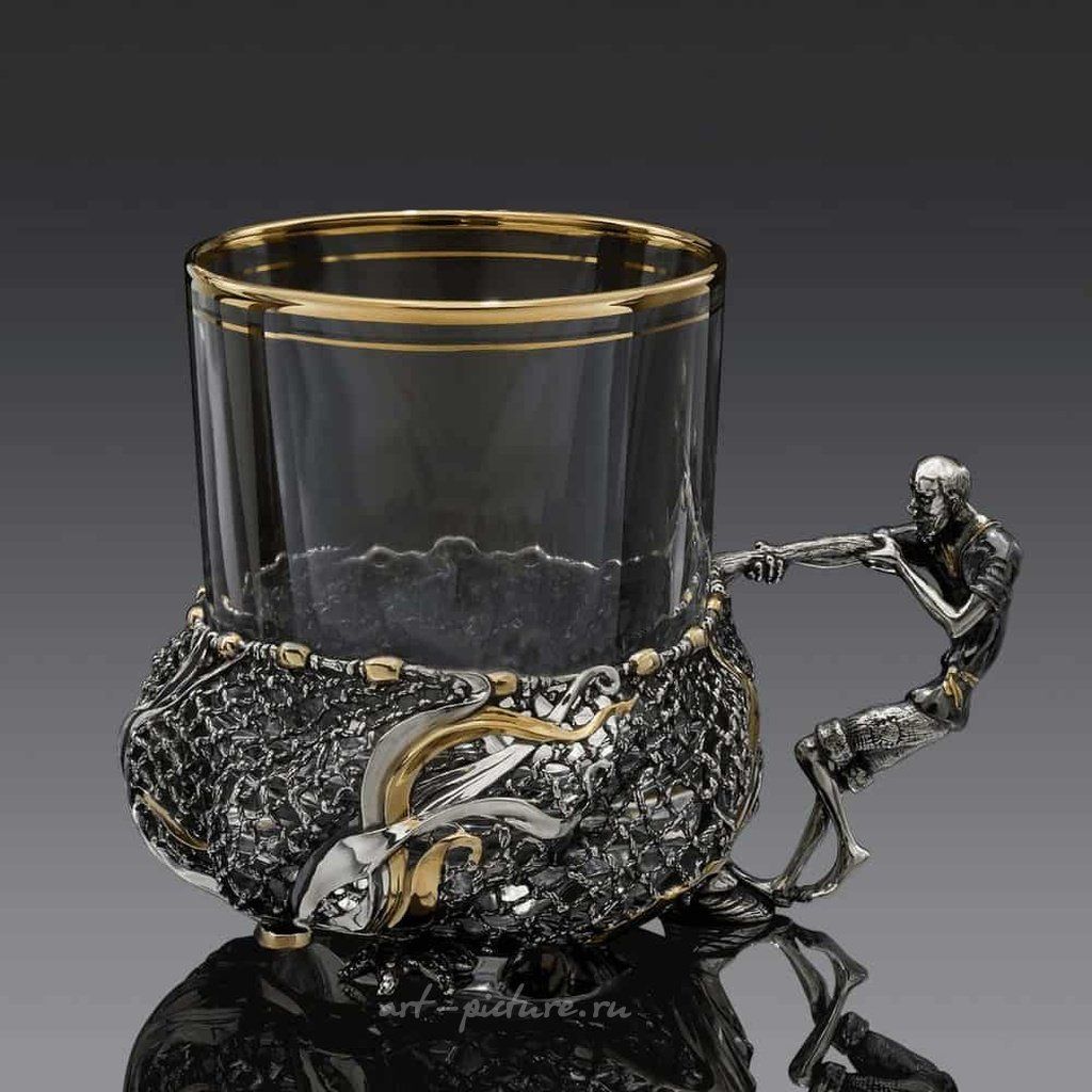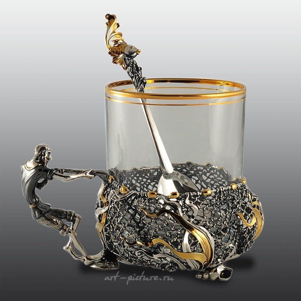 Подстаканник «Старик и невод» Художники: Бучин В.Е., Архангельская А.Л. Технологии: Литьё, золочение, оксидирование, гравирование Материал: Серебро 925 пробы, термостойкое стекло Размер (д/ш/в): 100х72x130 мм Вес изделия со стаканом: 470 г. Чайная ложка «Золотая рыбка» Художники: Бучин В.Е., Архангельская А.Л. Технологии: Литьё, золочение, оксидирование, гравирование Материал: Серебро 925 пробы Размер (д/ш/в): 137х28x13 мм Вес изделия: 28 г. Об изделии: Сказка о рыбаке и рыбке — всеми любимое произведение А.С.Пушкина. Сюжет сказки раскрывает, насколько осторожным надо быть со своими желаниями. Старик, как основной персонаж, предстает в сказке не безвольным человеком, а смиренным и мудрым. Во многих русских сказках часто случается чудо, попадающее человеку в руки. Вот и здесь старик поймал неводом золотую чудо-рыбку. Он долго трудился ради улова, но отпустил взмолившуюся рыбку и ничего не попросил взамен. Он счел для себя наградой само свершившееся чудо. Такая бессеребренность и доброта во многом свойственна нашему народу, и именно эту тему затронули художники в представленном изделии. Чайный прибор «Золотая Рыбка» состоит из подстаканника с чайной ложечкой. Сеть, оплетенная водорослями – основная часть подстаканника, гармонично сочетается с ручкой, выполненной в виде старика, тянущего свой невод. Легкость и реалистичность невода удивительно гармонирует со сказочным, порой юмористичным, образом старика. Его фигура кажется изможденной долгими трудами, но лицо застыло с неподдельным изумлением от необычного улова. Неотъемлемой частью композиции является сама золотая рыбка, размещенная на вершине волны — кончике чайной ложки. Композиция динамично превращается в диалог старика с Золотой рыбкой. И, несмотря на развернувшийся позднее сюжет этой сказки, Золотая рыбка была и остается в нашем народе символом удачи и воплощением мечты.