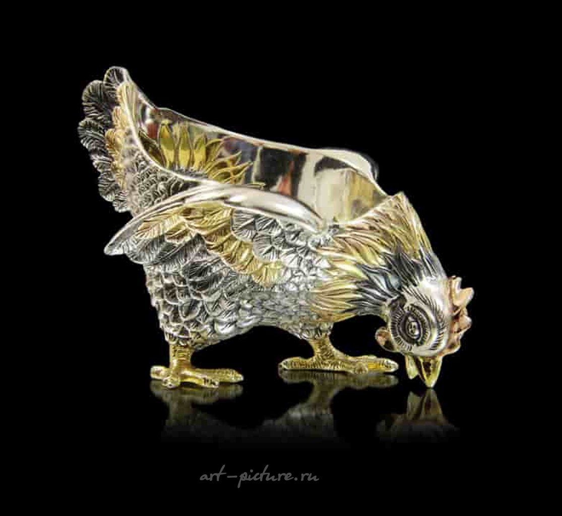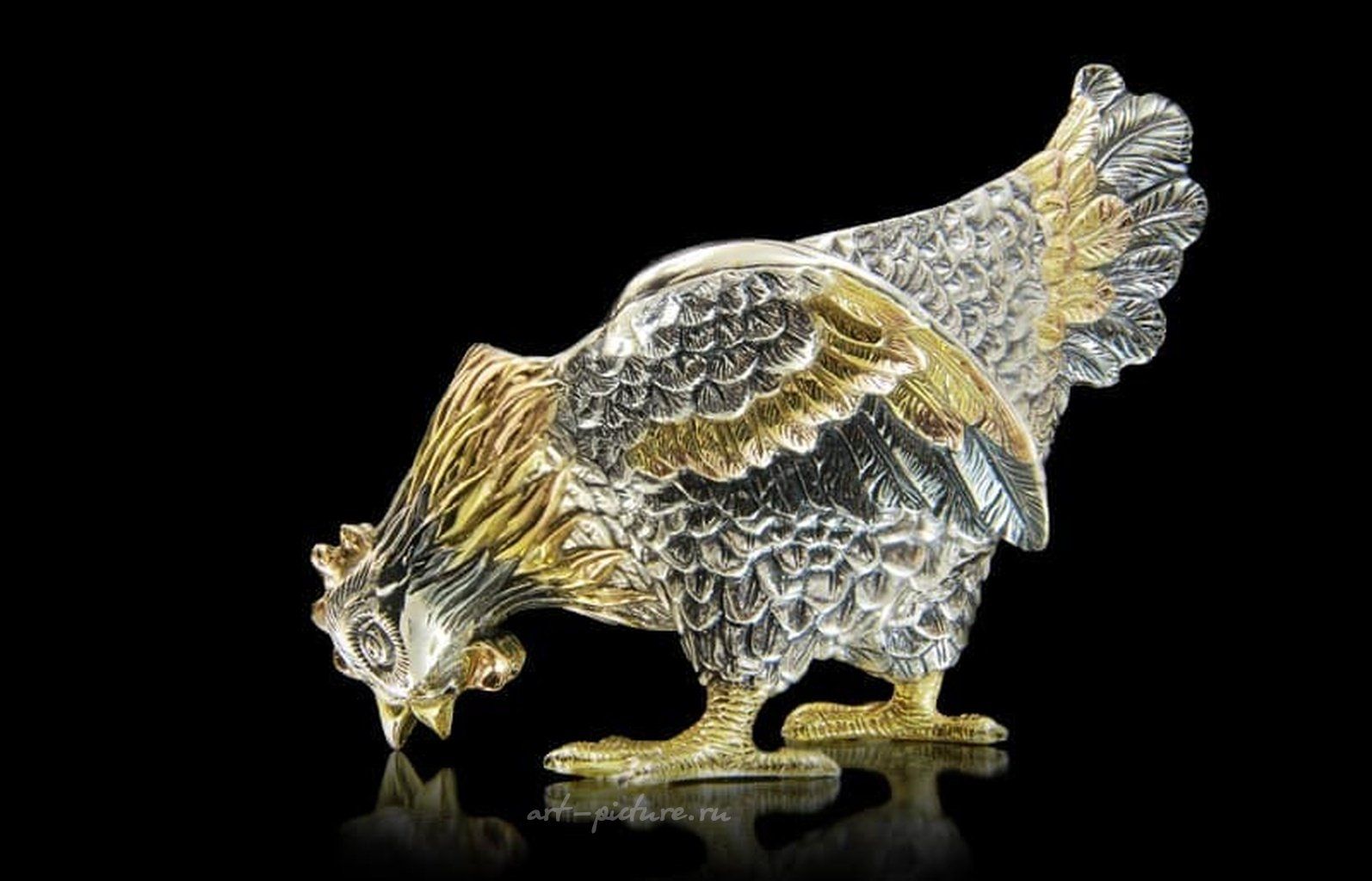 Материалы: Серебро с позолотой не просто придаёт предмету роскошный вид, но и подчеркивает его высокое качество и мастерство исполнителя. Каждый штрих, каждая текстура курицы говорит о высоком уровне исполнения. Для меня, как любителя искусства, это вдохновляет!
