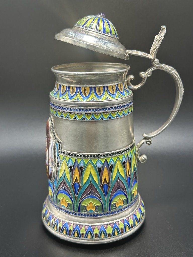О, как же может радовать сердце создание, наполненное историей и душой! Эта кружка для пива, выполненная в шикарной технике финифти, действительно является не просто предметом, а своеобразным окном в прошлое. В каждом изгибе и в каждом цвете скрыто множество эмоций — это не просто предмет обихода, а история, замершая в метале и эмали.