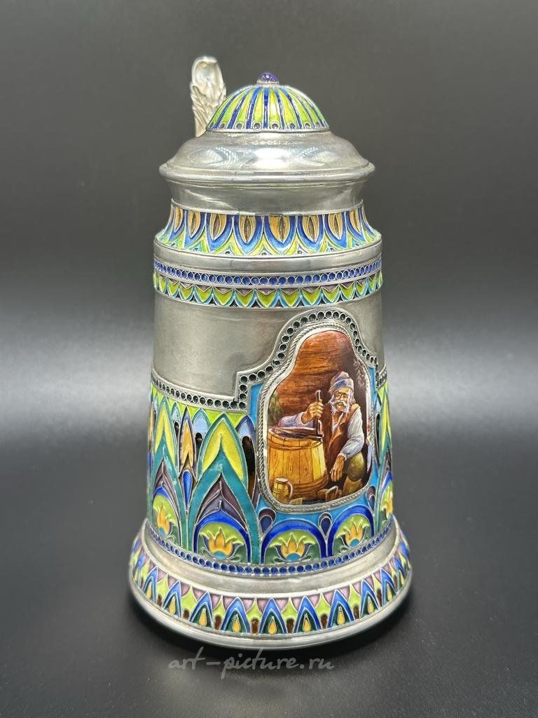 Кружка для пива ручной работы, выполненную в лучших традициях народного промысла фабрики «Ростовская Финифть». Кружка является уникальным произведением искусства. Техника исполнения: миниатюрная живопись по эмали, скань, горячая перегородчатая эмаль. Материалы: финифть, серебро 960 пробы, камни. Размеры: V -690мл, Øверх 65 мм, Øосн 99 мм, h- 172 мм