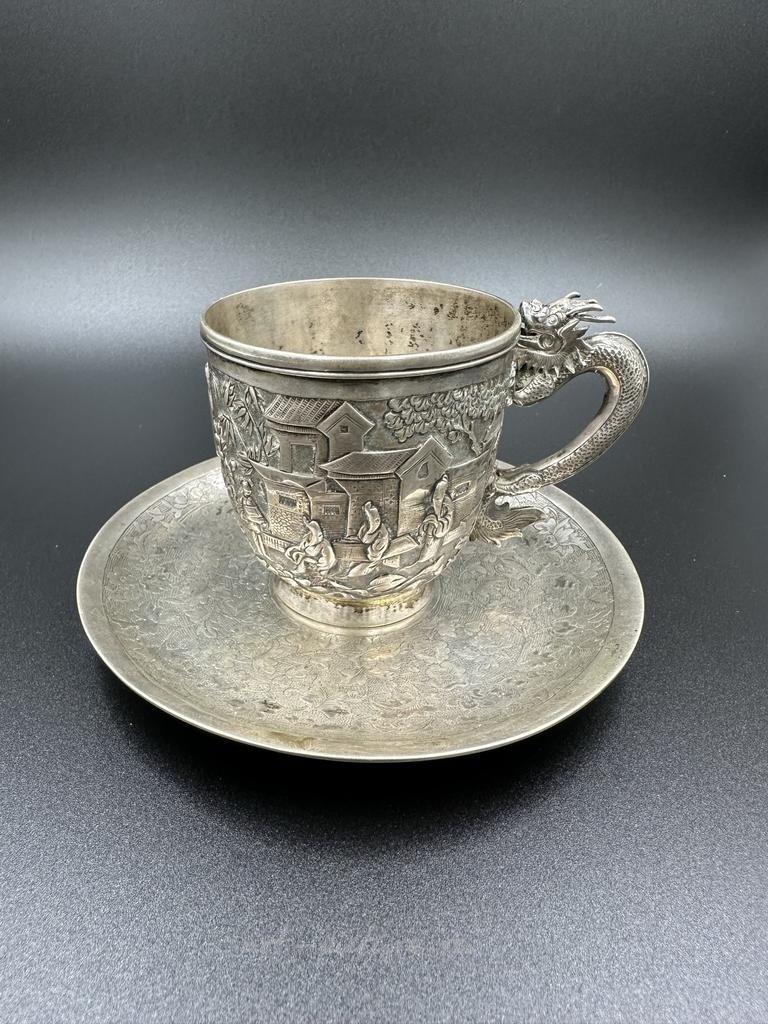 Китайская серебряная экспортная кружка с блюдцем, ручкой в виде дракона и щитом.Кружка представляет собой конструкцию с двойными стенками с изображением фигур в саду. Форма рукоятки является индикатором мастера.Есть много кружек с ручками в виде дракона, но каждый мастер делает ручку немного по-разному: шаг хвоста, его угол и размер.
