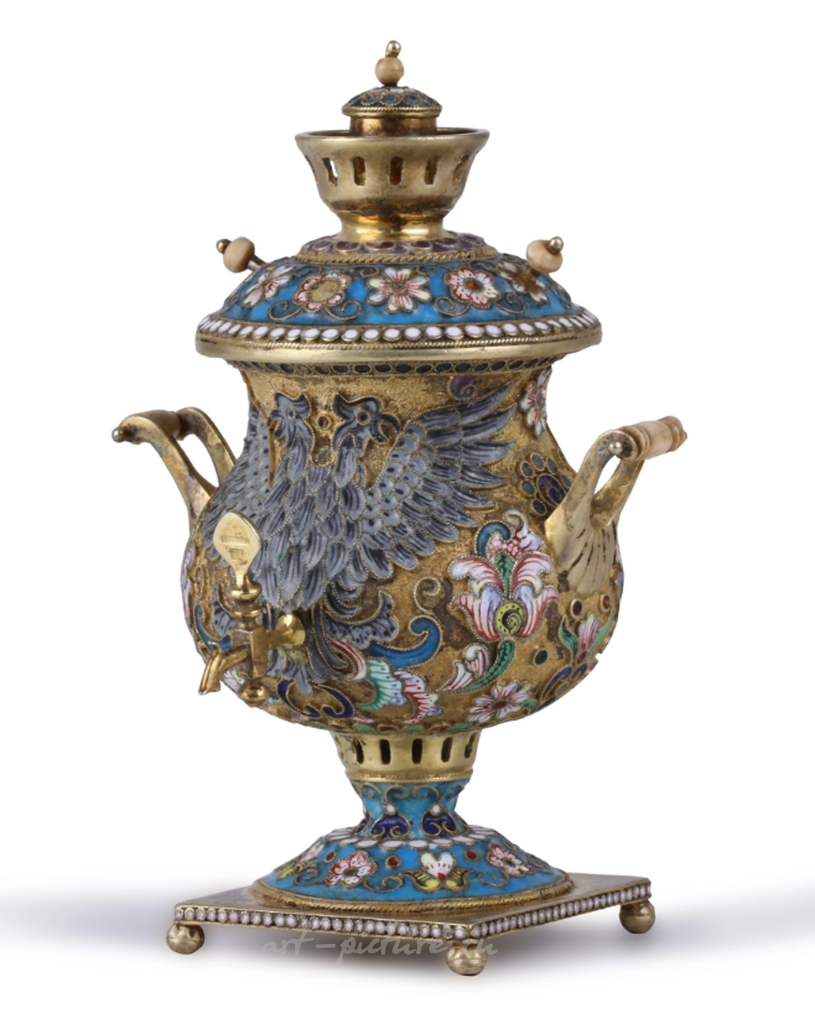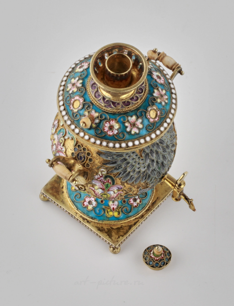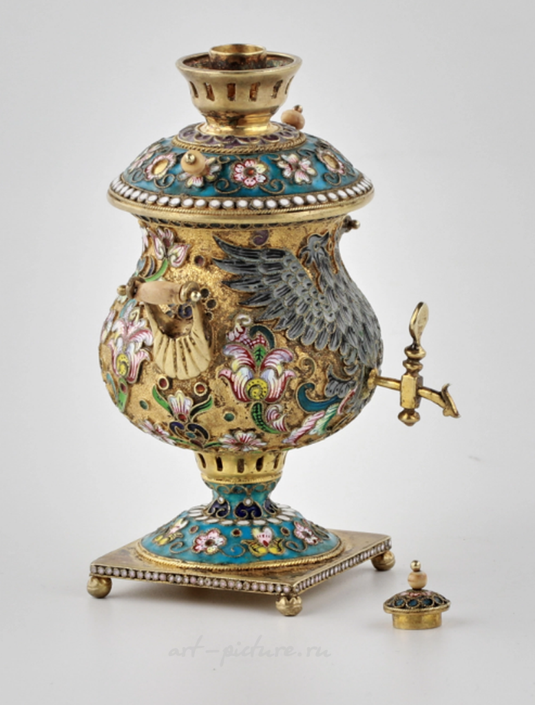 Внимание к деталям в этой работе поражает: цветочные орнаменты, выполненные в технике перегородчатой эмали, сверкают яркими, живыми оттенками, создавая эффект натуральности и близости к природе. Каждый лепесток, каждый завиток на этом декоре, кажется, дышит жизнью, наталкивая на мысли о цветущих садах и летнем теплоцветье. Кроме того, изображение орла, также выполненное с высокой степенью точности, добавляет элемент величественности и символизма, превращая обычный самовар в высокохудожественное произведение искусства.