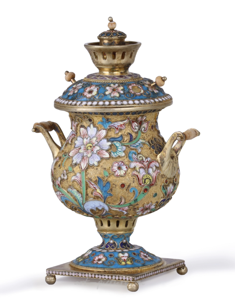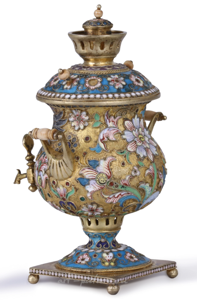 Неоклассика, как и предполагает её название, пытается вернуть к классическим формам, а также подчеркнуть элегантность и гармонию. В этом самоваре — изящные линии, гармоничные пропорции и четкие формы, которые создают образ чего-то поистине величественного и ценного. Однако, что особенно выделяет работу Коноваленко, так это его способность привнести в классические формы элементы современного толкования, что привлекает внимание к деталям и превращает данный объект в уникальное произведение. Орнаменты и декор, выполненные с использованием перегородчатой эмали, добавляют динамики и яркости, придавая самовару живое дыхание, тонко подчеркивающее красоту природы.